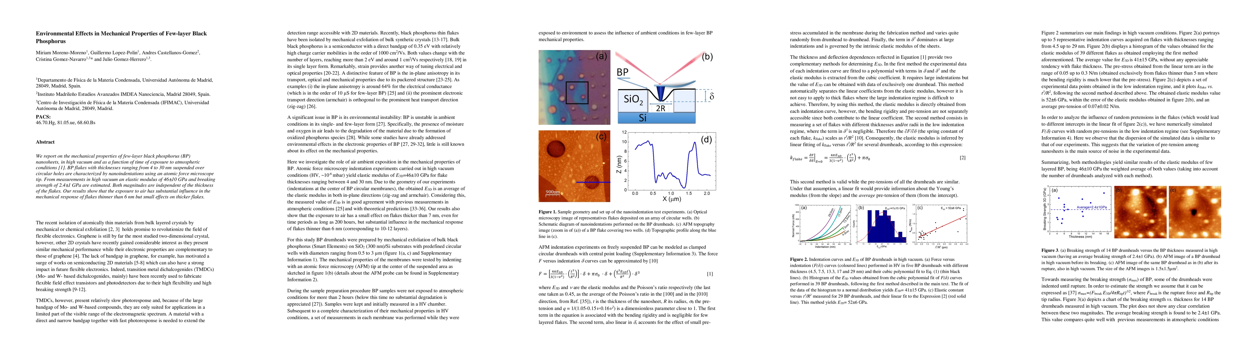 We report on the mechanical properties of few-layer black phosphorus (BP) nanosheets, in high vacuum and as a function of time of exposure to atmospheric conditions [1]. BP flakes with thicknesses ranging from 4 to 30 nm suspended over circular holes are characterized by nanoindentations using an atomic force microscope tip. From measurements in high vacuum an elastic modulus of 46+/-10 GPa and breaking strength of 2.4+/-1 GPa are estimated. Both magnitudes are independent of the thickness of the flakes. Our results show that the exposure to air has substantial influence in the mechanical response of flakes thinner than 6 nm but small effects on thicker flakes.