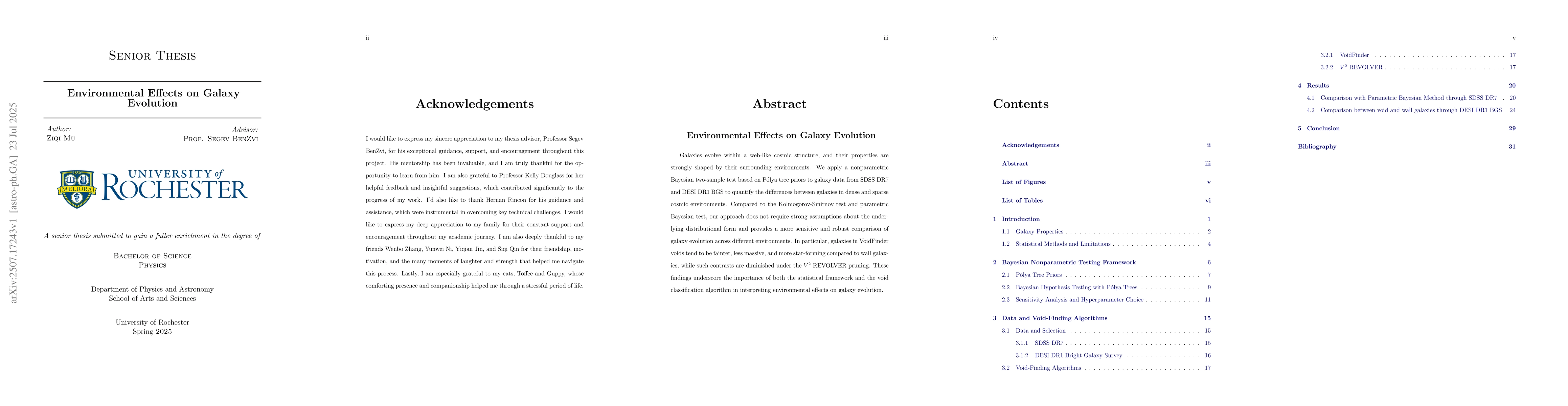 Galaxies evolve within a web-like cosmic structure, and their properties are strongly shaped by their surrounding environments. We apply a nonparametric Bayesian two-sample test based on P\'olya tree priors to galaxy data from SDSS DR7 and DESI DR1 BGS to quantify the differences between galaxies in dense and sparse cosmic environments. Compared to the Kolmogorov-Smirnov test and parametric Bayesian test, our approach does not require strong assumptions about the underlying distributional form and provides a more sensitive and robust comparison of galaxy evolution across different environments. In particular, galaxies in VoidFinder voids tend to be fainter, less massive, and more star-forming compared to wall galaxies, while such contrasts are diminished under the V^2 REVOLVER pruning. These findings underscore the importance of both the statistical framework and the void classification algorithm in interpreting environmental effects on galaxy evolution.