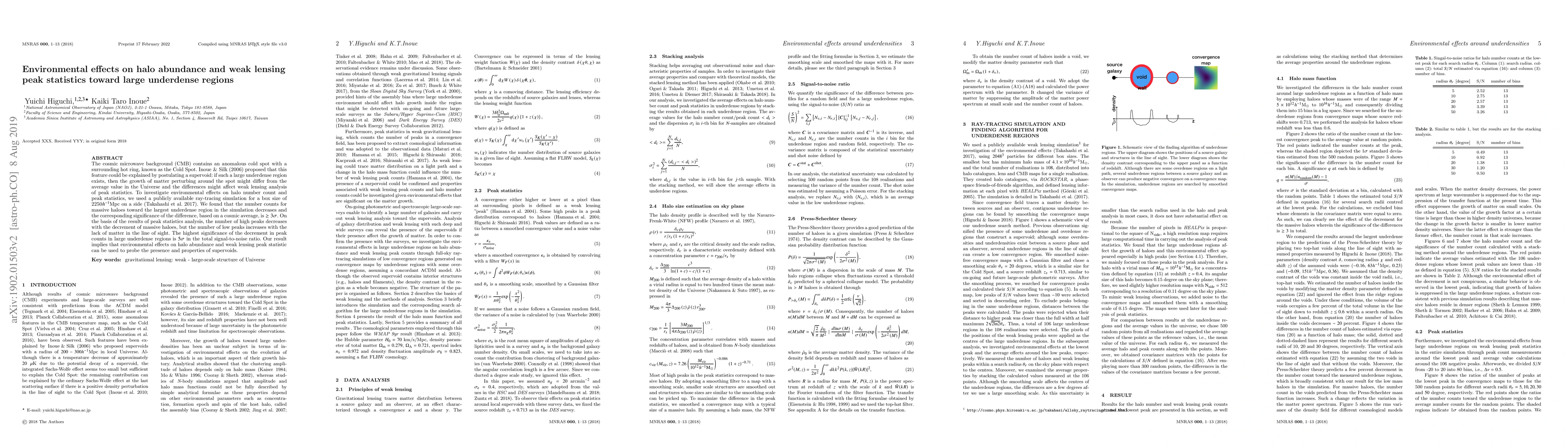 The cosmic microwave background (CMB) contains an anomalous cold spot with a surrounding hot ring, known as the Cold Spot. Inoue & Silk (2006) proposed that this feature could be explained by postulating a supervoid: if such a large underdense region exists, then the growth of matter perturbing around the spot might differ from the average value in the Universe and the differences might affect weak lensing analysis of peak statistics. To investigate environmental effects on halo number count and peak statistics, we used a publicly available ray-tracing simulation for a box size of 2250$h^{-1}$Mpc on a side (Takahashi et al. 2017). We found that the number counts for massive haloes toward the largest underdense region in the simulation decreases and the corresponding significance of the difference, based on a cosmic average, is $\geq3\sigma$. On the basis of the results of peak statistics analysis, the number of high peaks decreases with the decrement of massive haloes, but the number of low peaks increases with the lack of matter in the line of sight. The highest significance of the decrement in peak counts in large underdense regions is $5\sigma$ in the total signal-to-noise ratio. Our result implies that environmental effects on halo abundance and weak lensing peak statistic can be used to probe the presence and properties of supervoids.