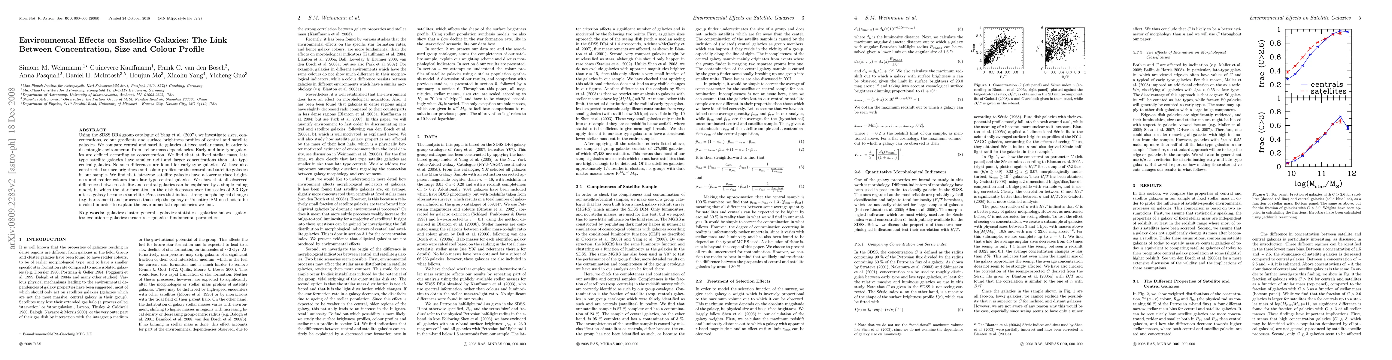 This study explores how environmental factors affect the sizes, concentrations, colors, and surface brightness of satellite galaxies compared to central galaxies, finding that satellites have smaller radii, higher concentrations, lower surface brightness, and redder colors, which can be explained by a simple fading model.
