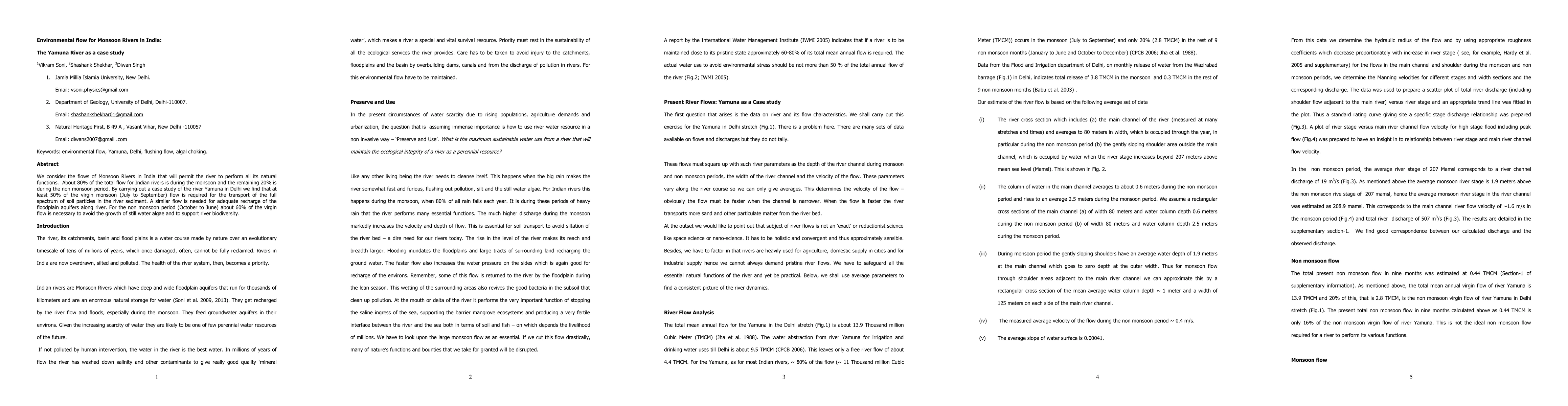 This paper investigates the environmental flow requirements for Monsoon Rivers in India, focusing on the Yamuna River in Delhi. It finds that at least 50% of the monsoon flow is essential for sediment transport and aquifer recharge, while 60% of the non-monsoon flow is needed to maintain biodiversity and prevent still water algae growth.