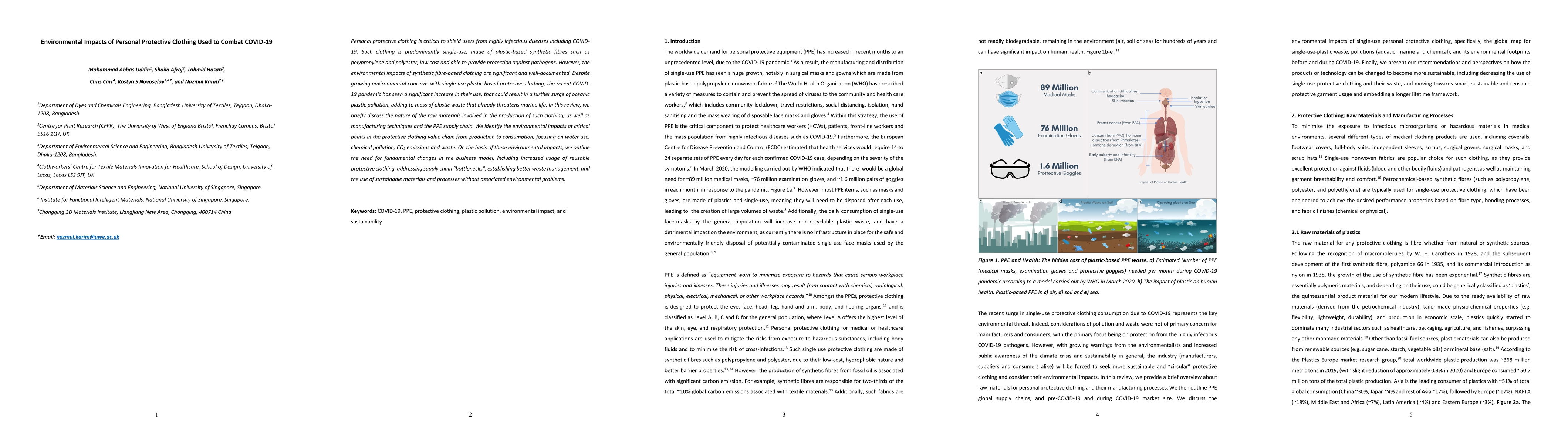 This paper reviews the environmental impacts of single-use plastic-based personal protective clothing used in the COVID-19 pandemic, highlighting issues like water use, chemical pollution, CO2 emissions, and waste. It advocates for a shift towards reusable clothing, improved supply chain management, better waste handling, and sustainable materials to mitigate these impacts.