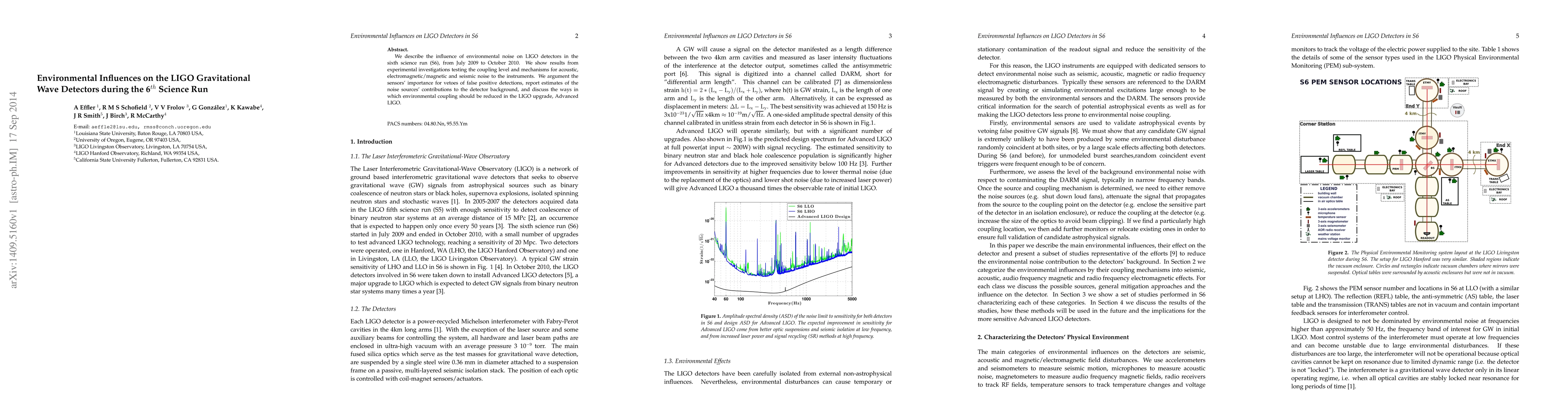 This paper investigates the environmental noise affecting LIGO detectors during the sixth science run, identifying acoustic, electromagnetic/magnetic, and seismic noise sources. It emphasizes the importance of these sensors for preventing false positive gravitational wave detections and outlines strategies for reducing environmental coupling in the LIGO upgrade, Advanced LIGO.