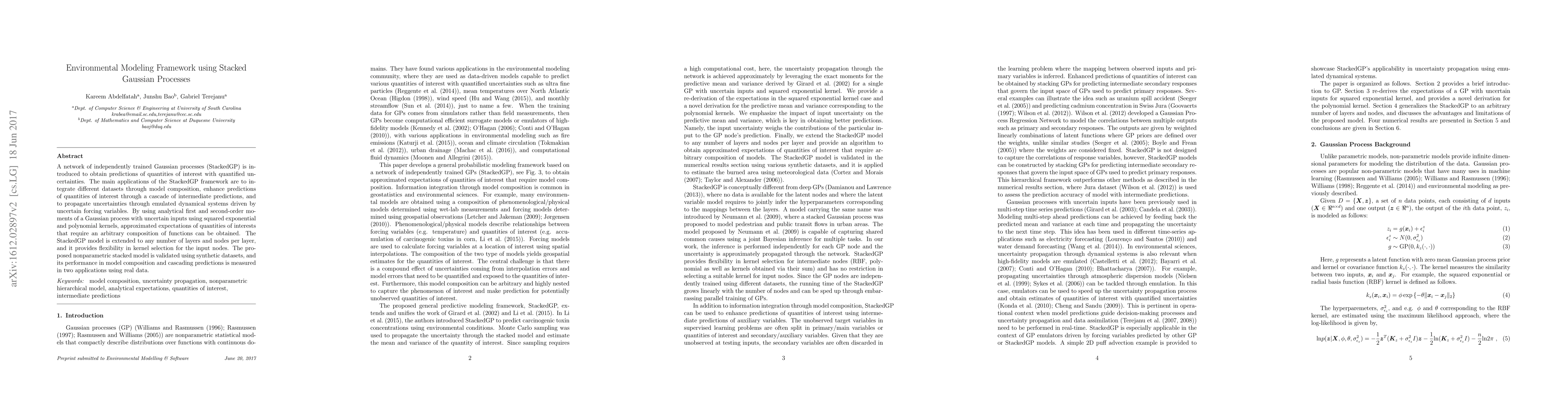 A network of independently trained Gaussian processes (StackedGP) is introduced to obtain predictions of quantities of interest with quantified uncertainties. The main applications of the StackedGP framework are to integrate different datasets through model composition, enhance predictions of quantities of interest through a cascade of intermediate predictions, and to propagate uncertainties through emulated dynamical systems driven by uncertain forcing variables. By using analytical first and second-order moments of a Gaussian process with uncertain inputs using squared exponential and polynomial kernels, approximated expectations of quantities of interests that require an arbitrary composition of functions can be obtained. The StackedGP model is extended to any number of layers and nodes per layer, and it provides flexibility in kernel selection for the input nodes. The proposed nonparametric stacked model is validated using synthetic datasets, and its performance in model composition and cascading predictions is measured in two applications using real data.