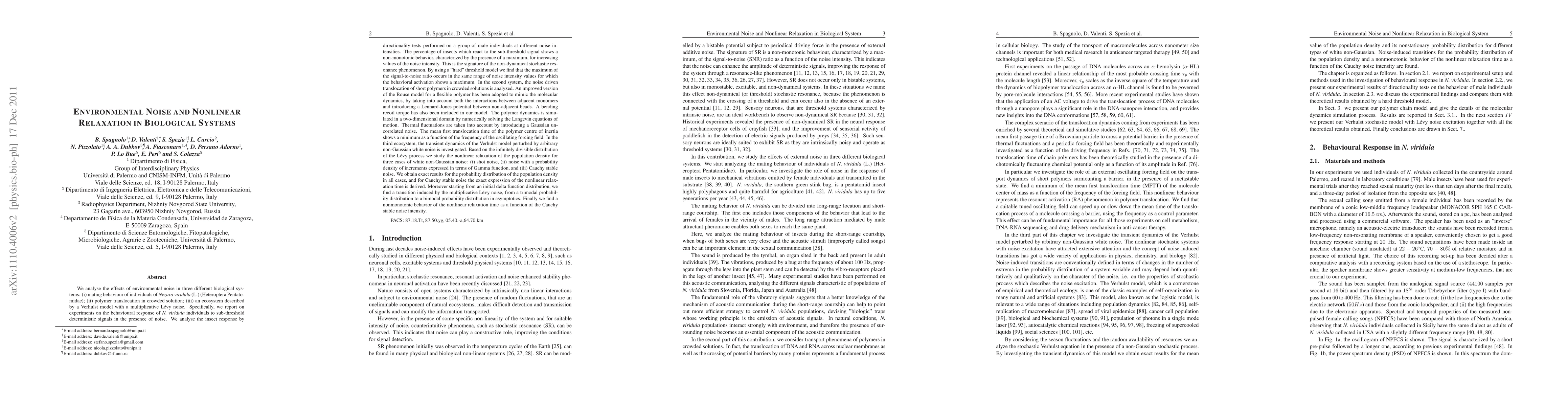 We analyse the effects of environmental noise in three different biological systems: (i) mating behaviour of individuals of \emph{Nezara viridula} (L.) (Heteroptera Pentatomidae); (ii) polymer translocation in crowded solution; (iii) an ecosystem described by a Verhulst model with a multiplicative L\'{e}vy noise.