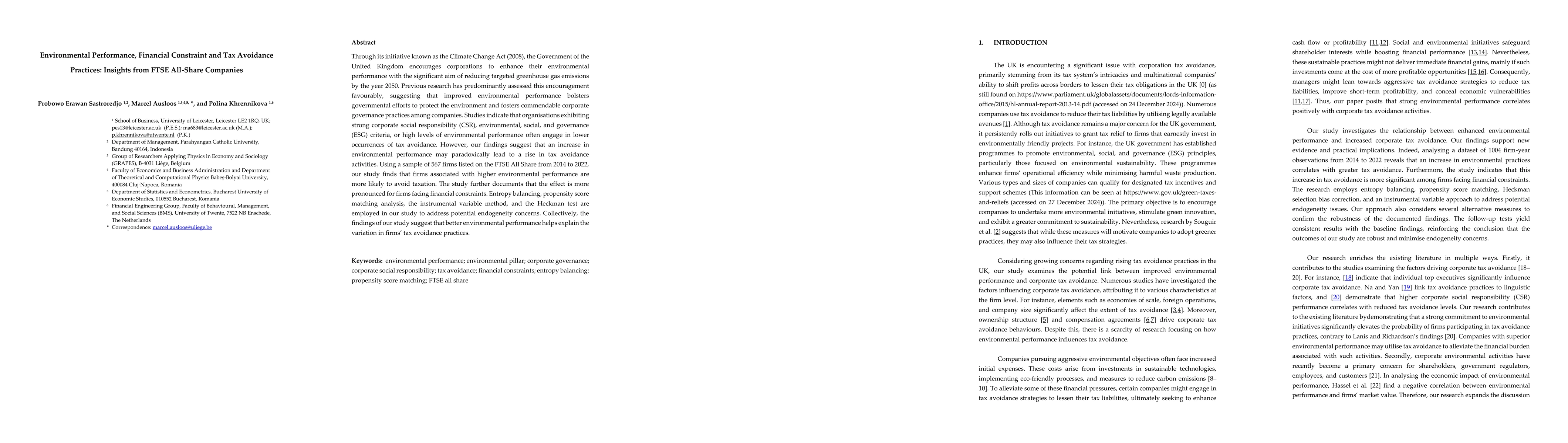 Through its initiative known as the Climate Change Act (2008), the Government of the United Kingdom encourages corporations to enhance their environmental performance with the significant aim of reducing targeted greenhouse gas emissions by the year 2050. Previous research has predominantly assessed this encouragement favourably, suggesting that improved environmental performance bolsters governmental efforts to protect the environment and fosters commendable corporate governance practices among companies. Studies indicate that organisations exhibiting strong corporate social responsibility (CSR), environmental, social, and governance (ESG) criteria, or high levels of environmental performance often engage in lower occurrences of tax avoidance. However, our findings suggest that an increase in environmental performance may paradoxically lead to a rise in tax avoidance activities. Using a sample of 567 firms listed on the FTSE All Share from 2014 to 2022, our study finds that firms associated with higher environmental performance are more likely to avoid taxation. The study further documents that the effect is more pronounced for firms facing financial constraints. Entropy balancing, propensity score matching analysis, the instrumental variable method, and the Heckman test are employed in our study to address potential endogeneity concerns. Collectively, the findings of our study suggest that better environmental performance helps explain the variation in firms tax avoidance practices.