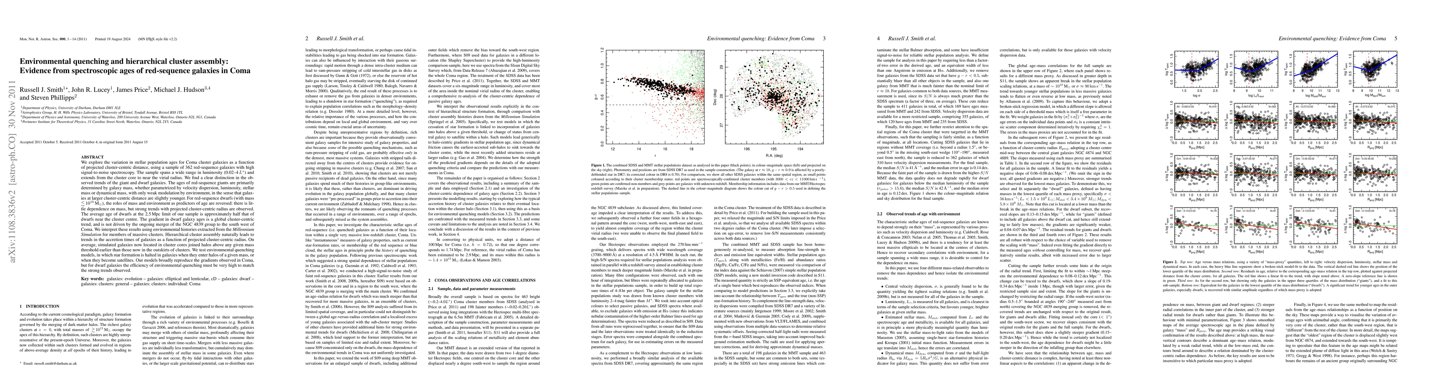 We explore the variation in stellar population ages for Coma cluster galaxies as a function of projected cluster-centric distance, using a sample of 362 red-sequence galaxies with high signal-to-noise spectroscopy. The sample spans a wide range in luminosity (0.02-4 L*) and extends from the cluster core to near the virial radius. We find a clear distinction in the observed trends of the giant and dwarf galaxies. The ages of red-sequence giants are primarily determined by galaxy mass, with only weak modulation by environment, in the sense that galaxies at larger cluster-centric distance are slightly younger. For red-sequence dwarfs (with mass <10^10 Msun), the roles of mass and environment as predictors of age are reversed: there is little dependence on mass, but strong trends with projected cluster-centric radius are observed. The average age of dwarfs at the 2.5 Mpc limit of our sample is approximately half that of dwarfs near the cluster centre. The gradient in dwarf galaxy ages is a global cluster-centric trend, and is not driven by the ongoing merger of the NGC 4839 group to the south west of Coma. We interpret these results using environmental histories extracted from the Millennium Simulation for members of massive clusters. Hierarchical cluster assembly naturally leads to trends in the accretion times of galaxies as a function of projected cluster-centric radius. On average, simulated galaxies now located in cluster cores joined halos above any given mass threshold earlier than those now located in the outskirts of clusters. We test environmental quenching models, in which star formation is halted in galaxies when they enter halos of a given mass, or become satellite galaxies. The models broadly reproduce the gradients observed in Coma, but for dwarf galaxies the efficiency of environmental quenching must be very high to match the strong trends observed.