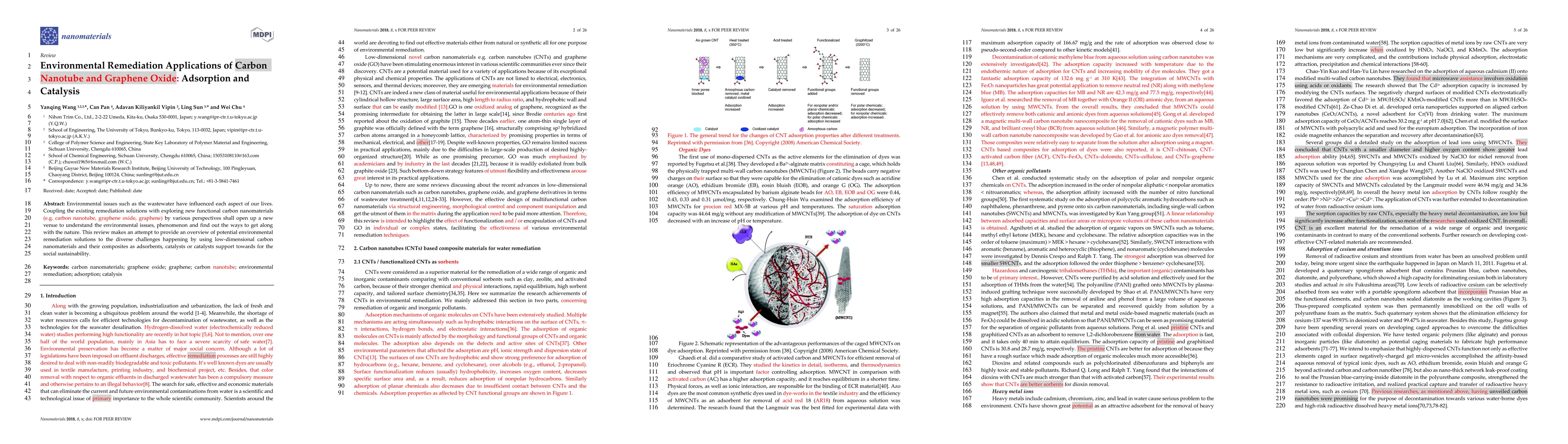 Environmental issues such as the wastewater have influenced each aspect of our lives. Coupling the existing remediation solutions with exploring new functional carbon nanomaterials (e.g. carbon nanotube, graphene oxide, graphene) by various perspectives shall open up a new venue to understand the environmental issues, phenomenon and find out the ways to get along with the nature. This review makes an attempt to provide an overview of potential environmental remediation solutions to the diverse challenges happening by using low-dimensional carbon nanomaterials and their composites as adsorbents, catalysts or catalysts support towards for the social sustainability.