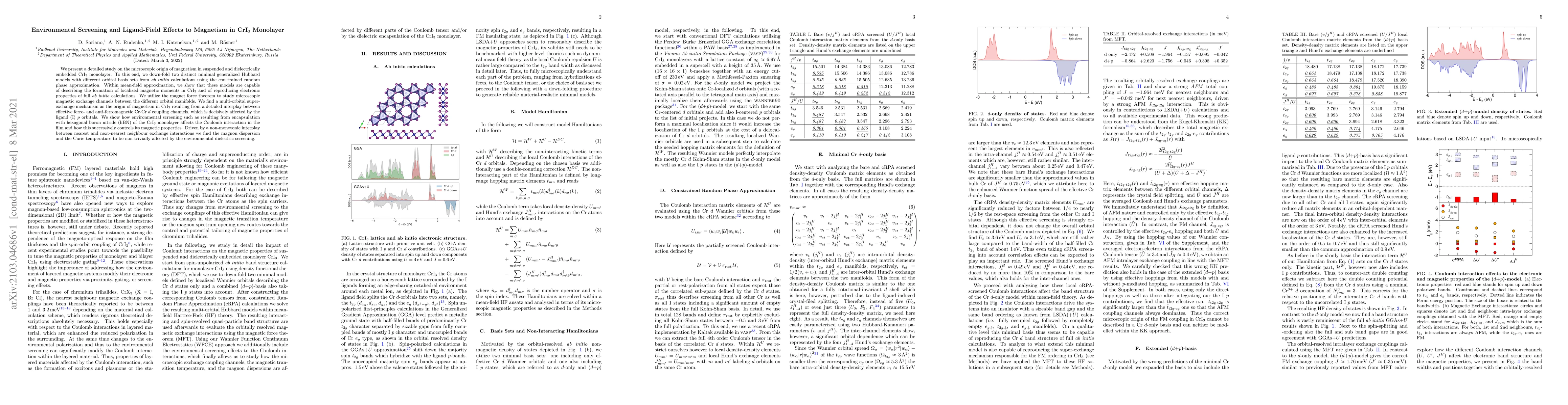 We present a detailed study on the microscopic origin of magnetism in suspended and dielectrically embedded CrI$_3$ monolayer. To this end, we down-fold two distinct minimal generalized Hubbard models with different orbital basis sets from \emph{ab initio} calculations using the constrained random phase approximation. Within mean-field approximation, we show that these models are capable of describing the formation of localized magnetic moments in CrI$_3$ and of reproducing electronic properties of full \emph{ab initio} calculations. We utilize the magnetic force theorem to study microscopic magnetic exchange channels between the different orbital manifolds. We find a multi-orbital super-exchange mechanism as the origin of magnetism in CrI$_3$ resulting from a detailed interplay between effective ferro- and anti-ferromagnetic Cr-Cr $d$ coupling channels, which is decisively affected by the ligand (I) $p$ orbitals. We show how environmental screening such as resulting from encapsulation with hexagonal boron nitride (hBN) of the CrI$_3$ monolayer affects the Coulomb interaction in the film and how this successively controls its magnetic properties. Driven by a non-monotonic interplay between nearest and next-nearest neighbour exchange interactions we find the magnon dispersion and the Curie temperature to be non-trivially affected by the environmental dielectric screening.