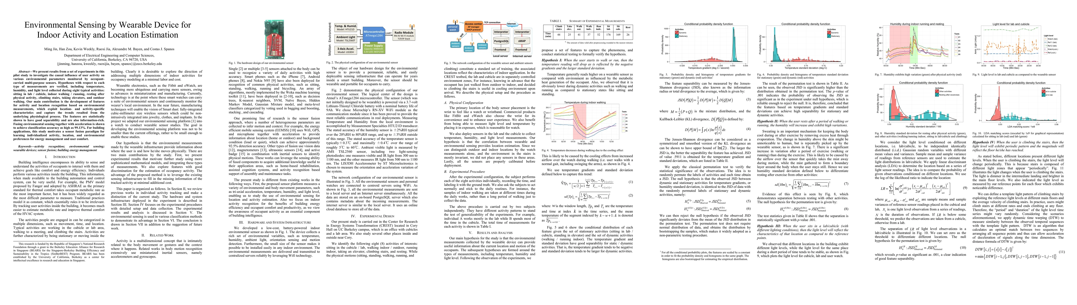 We present results from a set of experiments in this pilot study to investigate the causal influence of user activity on various environmental parameters monitored by occupant carried multi-purpose sensors. Hypotheses with respect to each type of measurements are verified, including temperature, humidity, and light level collected during eight typical activities: sitting in lab / cubicle, indoor walking / running, resting after physical activity, climbing stairs, taking elevators, and outdoor walking. Our main contribution is the development of features for activity and location recognition based on environmental measurements, which exploit location- and activity-specific characteristics and capture the trends resulted from the underlying physiological process. The features are statistically shown to have good separability and are also information-rich. Fusing environmental sensing together with acceleration is shown to achieve classification accuracy as high as 99.13%. For building applications, this study motivates a sensor fusion paradigm for learning individualized activity, location, and environmental preferences for energy management and user comfort.
