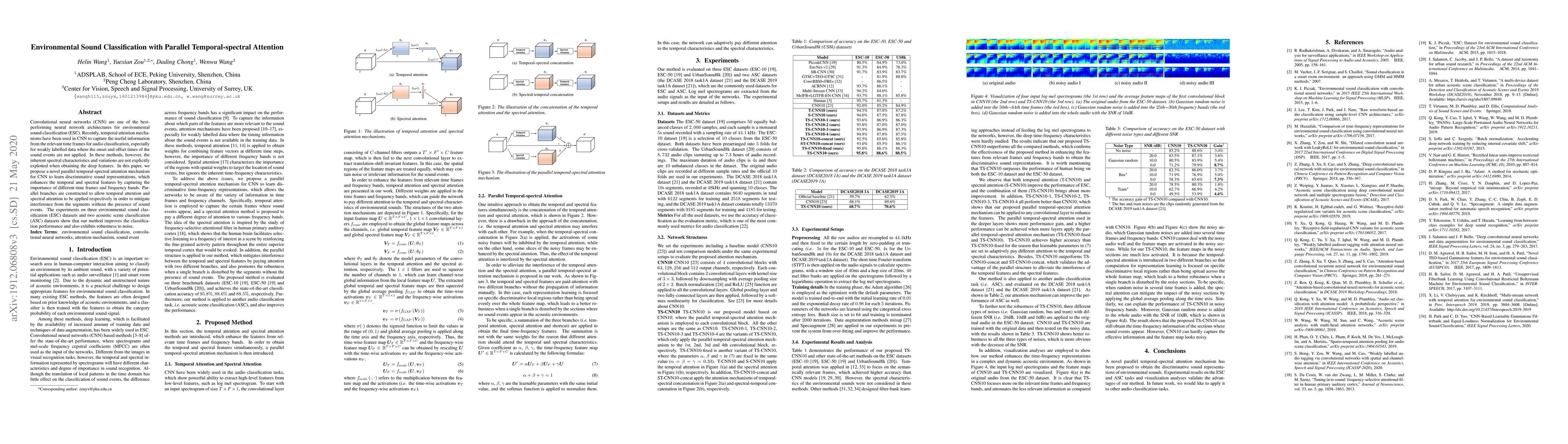 This paper proposes a novel parallel temporal-spectral attention mechanism for CNNs to improve environmental sound classification. The method enhances temporal and spectral features by capturing the importance of different time frames and frequency bands, leading to better performance and noise robustness.