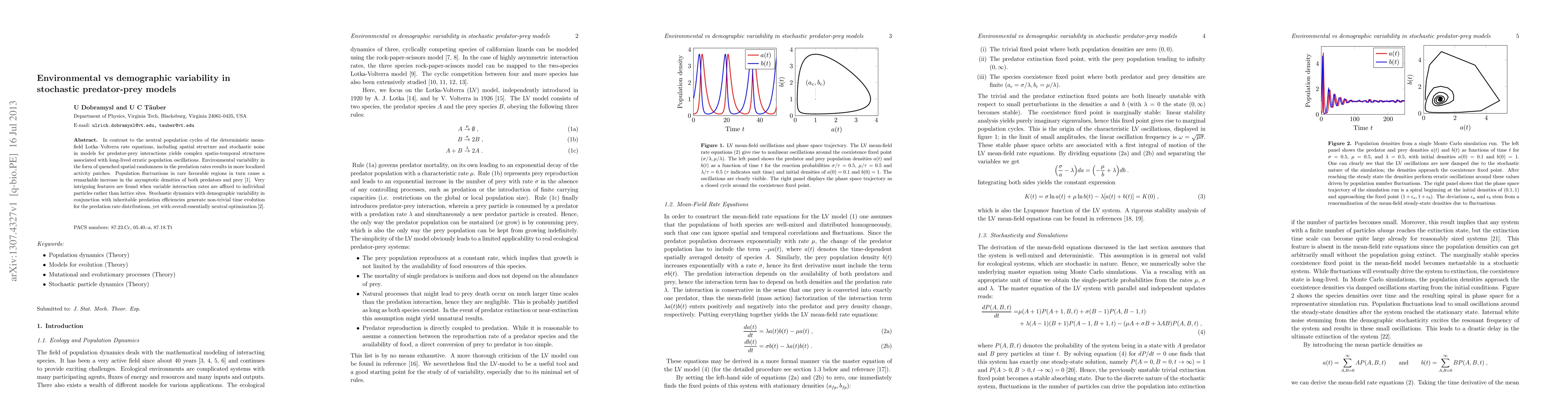 In contrast to the neutral population cycles of the deterministic mean-field Lotka--Volterra rate equations, including spatial structure and stochastic noise in models for predator-prey interactions yields complex spatio-temporal structures associated with long-lived erratic population oscillations. Environmental variability in the form of quenched spatial randomness in the predation rates results in more localized activity patches. Population fluctuations in rare favorable regions in turn cause a remarkable increase in the asymptotic densities of both predators and prey. Very intriguing features are found when variable interaction rates are affixed to individual particles rather than lattice sites. Stochastic dynamics with demographic variability in conjunction with inheritable predation efficiencies generate non-trivial time evolution for the predation rate distributions, yet with overall essentially neutral optimization.