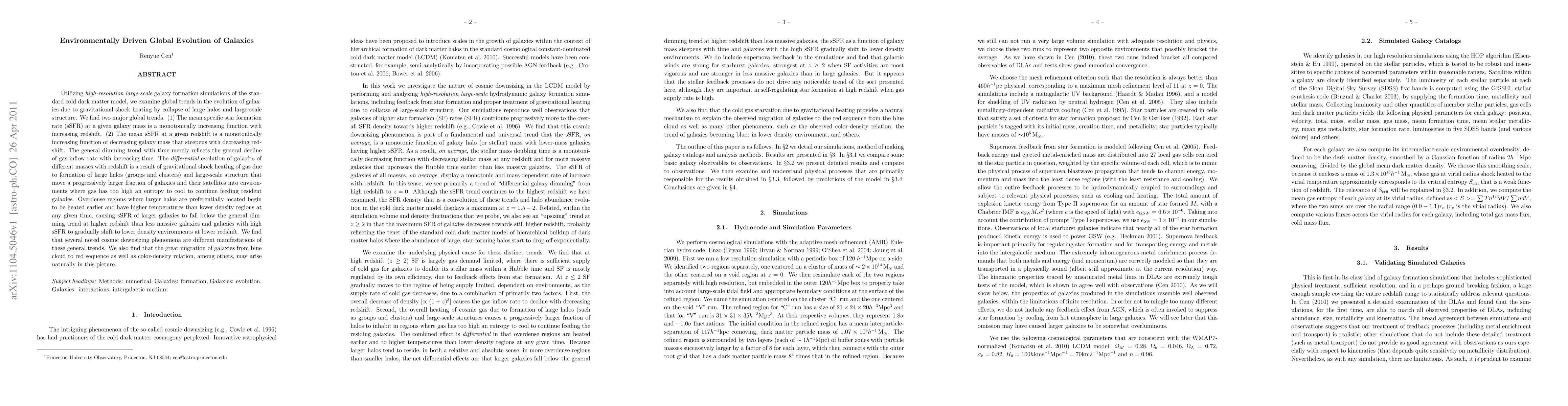 This research uses galaxy formation simulations to identify two major global trends in galaxy evolution: a monotonic increase in specific star formation rate (sSFR) with redshift at a given mass, and a steeper increase of sSFR with decreasing mass at a given redshift. These trends result from gravitational shock heating caused by large halo and large-scale structure formation, leading to entropy-induced cooling failures in massive galaxies at earlier times and explaining phenomena like cosmic downsizing, great migration, and color-density relation.