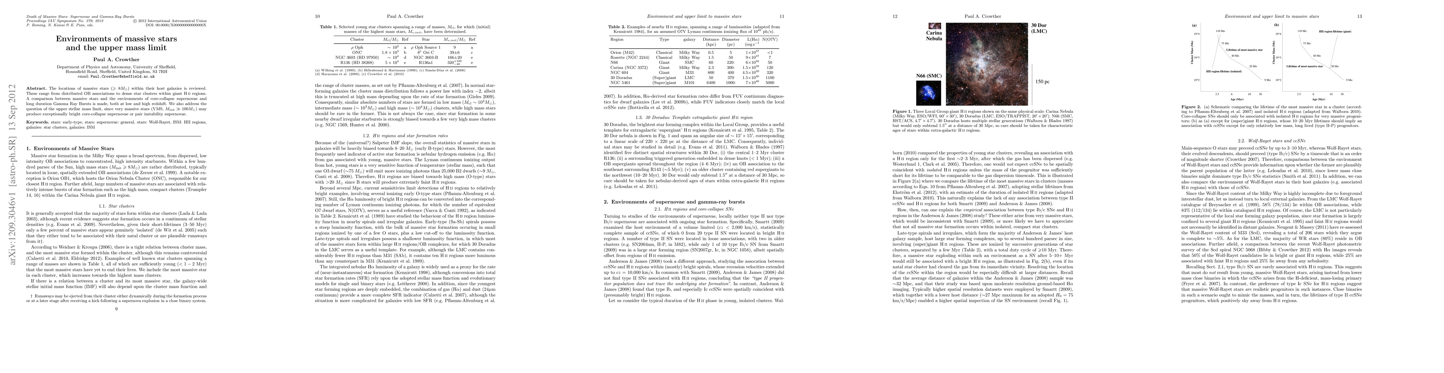 This paper reviews the environments of massive stars (>8 Msun) in galaxies, contrasting distributed OB associations with dense star clusters. It also compares these environments with those of core-collapse supernovae and long-duration Gamma Ray Bursts at various redshifts. The study addresses the upper stellar mass limit, considering the potential existence of very massive stars (VMS) that could result in unique supernovae.