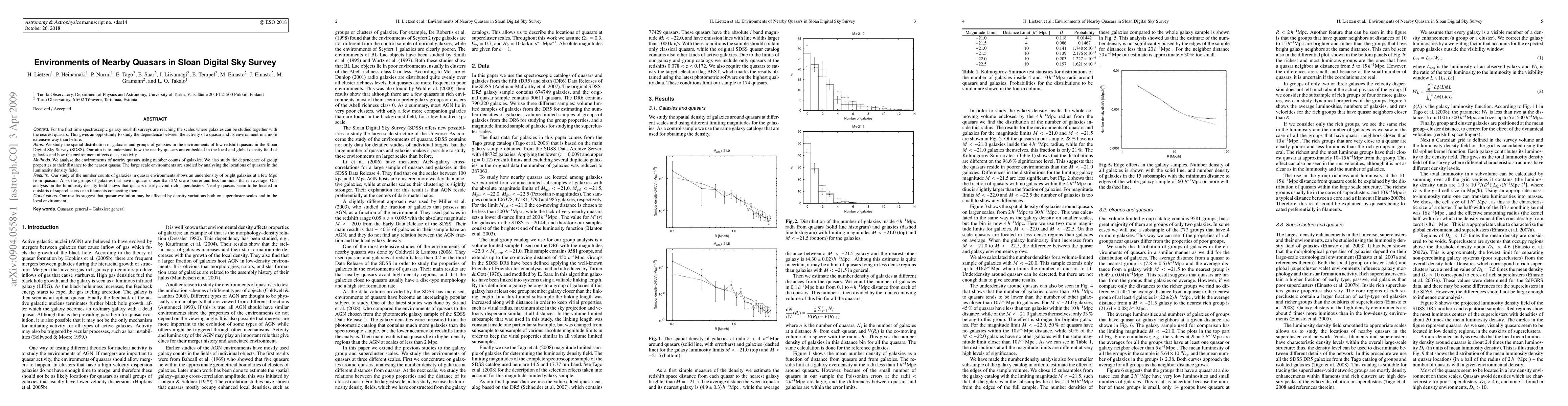 This study investigates the spatial distribution of galaxies around nearby quasars in the Sloan Digital Sky Survey, revealing an underdensity of bright galaxies near quasars and poorer, less luminous groups within 2 Mpc. Quasars tend to avoid rich superclusters, often residing in their outskirts or in filaments, suggesting density variations influence quasar activity on both large and small scales.