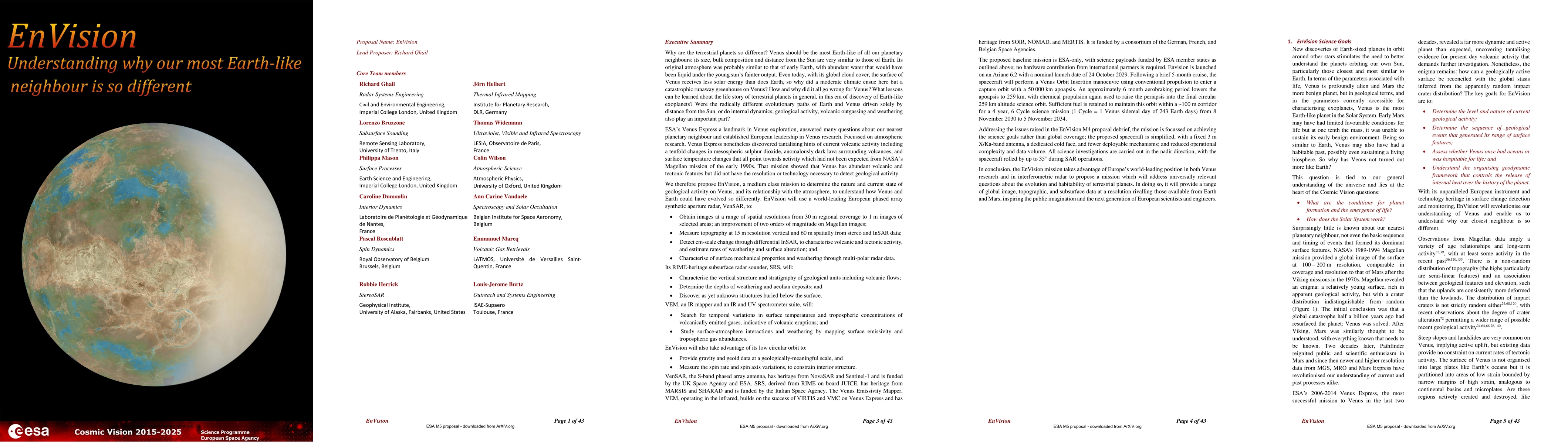 This document is the EnVision Venus orbiter proposal, submitted in October 2016 in response to ESA's M5 call for Medium-size missions for its Science Programme, for launch in 2029. Why are the terrestrial planets so different? Venus should be the most Earth-like of all our planetary neighbours: its size, bulk composition and distance from the Sun are very similar to those of Earth. Its original atmosphere was probably similar to that of early Earth, with abundant water that would have been liquid under the young sun's fainter output. Even today, with its global cloud cover, the surface of Venus receives less solar energy than does Earth, so why did a moderate climate ensue here but a catastrophic runaway greenhouse on Venus? How and why did it all go wrong for Venus? What lessons can be learned about the life story of terrestrial planets in general, in this era of discovery of Earth-like exoplanets? Were the radically different evolutionary paths of Earth and Venus driven solely by distance from the Sun, or do internal dynamics, geological activity, volcanic outgassing and weathering also play an important part? Following the primarily atmospheric focus of Venus Express, we propose a new Venus orbiter named EnVision, to focus on Venus' geology and geochemical cycles, seeking evidence for present and past activity. The payload comprises a state-of-the-art S-band radar which will be able to return imagery at spatial resolutions of 1 - 30 m, and capable of measuring cm-scale deformation; this is complemented by subsurface radar, IR and UV spectrometers to map volcanic gases, and by geodetic investigations.