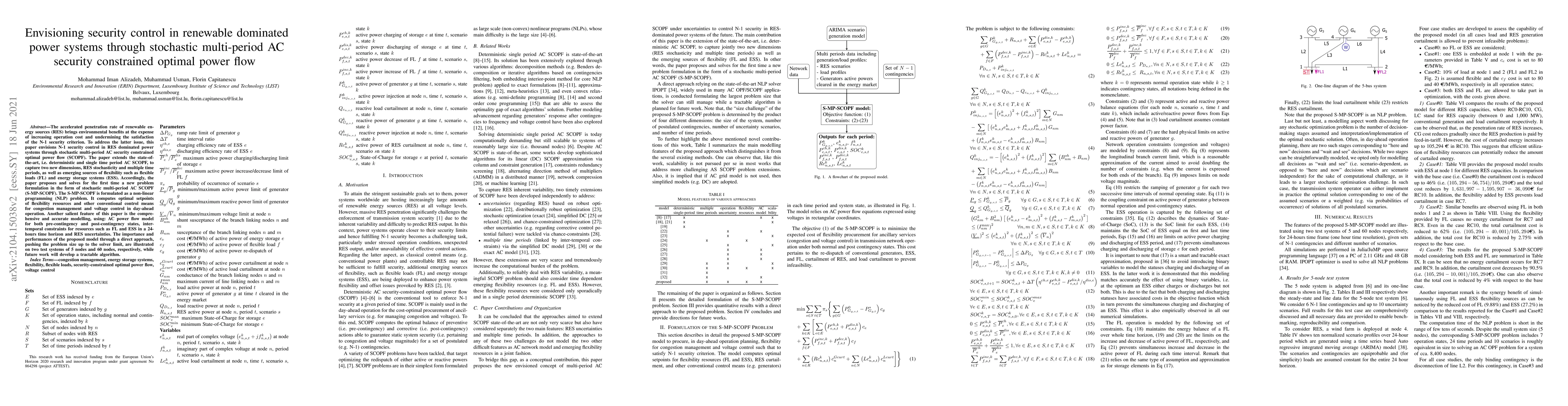 This paper proposes a stochastic multi-period AC security constrained optimal power flow (S-MP-SCOPF) model to address N-1 security in renewable energy-dominated power systems, incorporating flexibility resources like flexible loads and energy storage. The model is formulated as a non-linear programming problem to compute optimal control measures for congestion and voltage management.