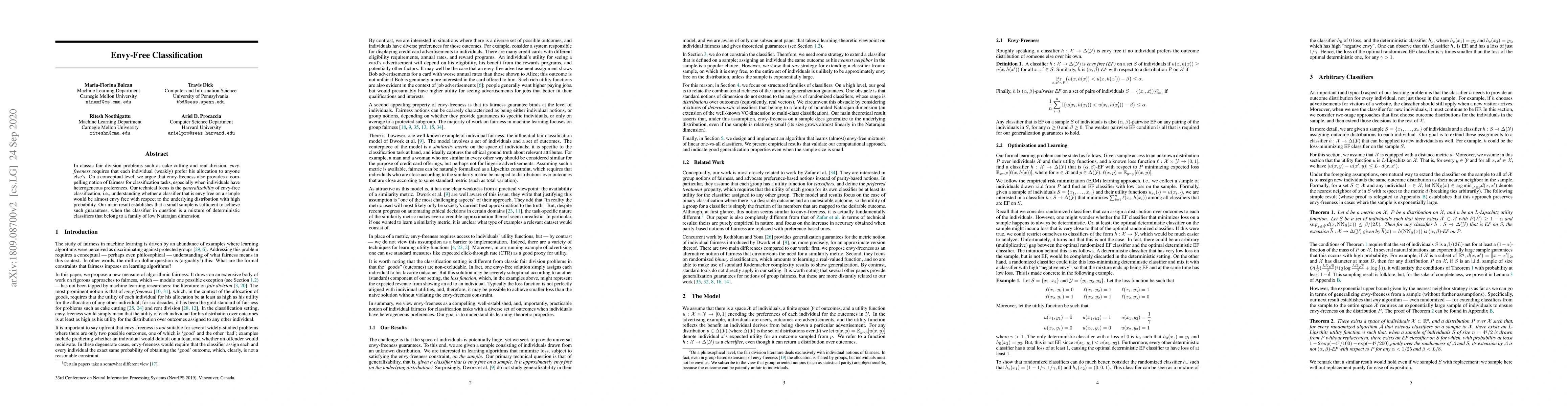This paper explores the concept of envy-freeness in classification tasks, arguing that it offers a fair notion of distribution. It demonstrates that a small sample size can ensure a classifier remains envy-free with high probability, provided the classifier is a mixture of deterministic classifiers with low Natarajan dimension.