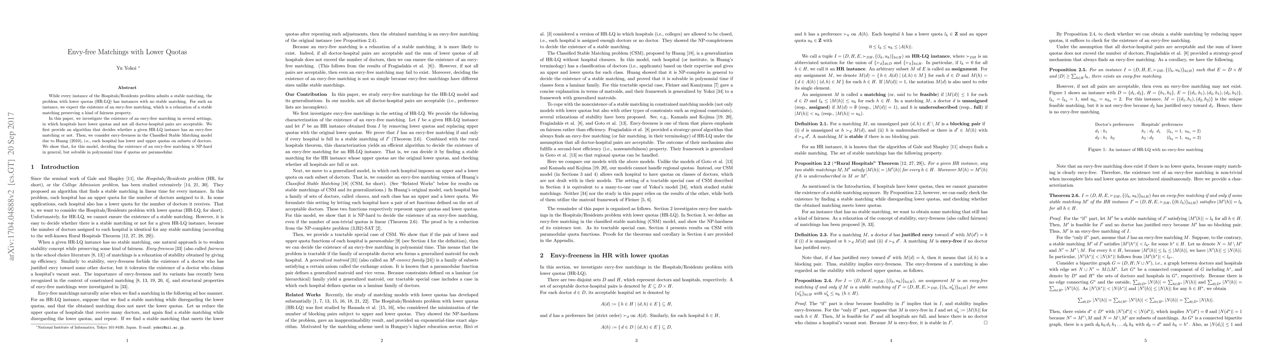 This paper investigates the existence of envy-free matchings in the Hospitals/Residents problem with lower quotas, where traditional stable matchings may not exist. It demonstrates efficient methods to determine envy-free matchings in various settings and highlights the complexity of finding such matchings in the Classified Stable Matching model.