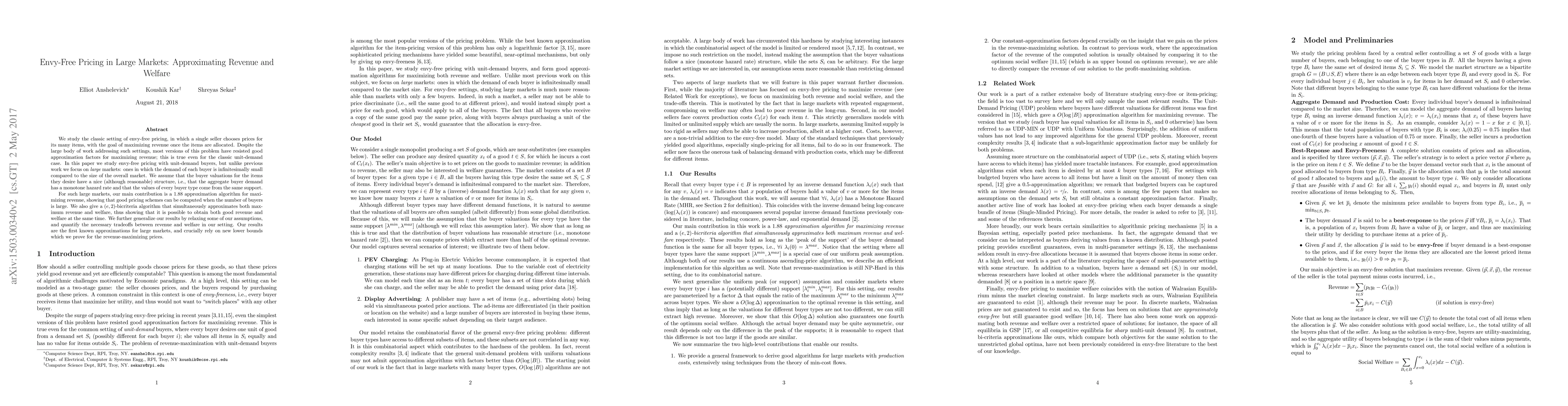 This paper presents an 1.88 approximation algorithm for maximizing revenue in envy-free pricing scenarios with unit-demand buyers in large markets where individual buyer demand is negligible. It also introduces a (e,2)-bicriteria algorithm that approximates both maximum revenue and welfare, offering the first known approximations for such large market settings.