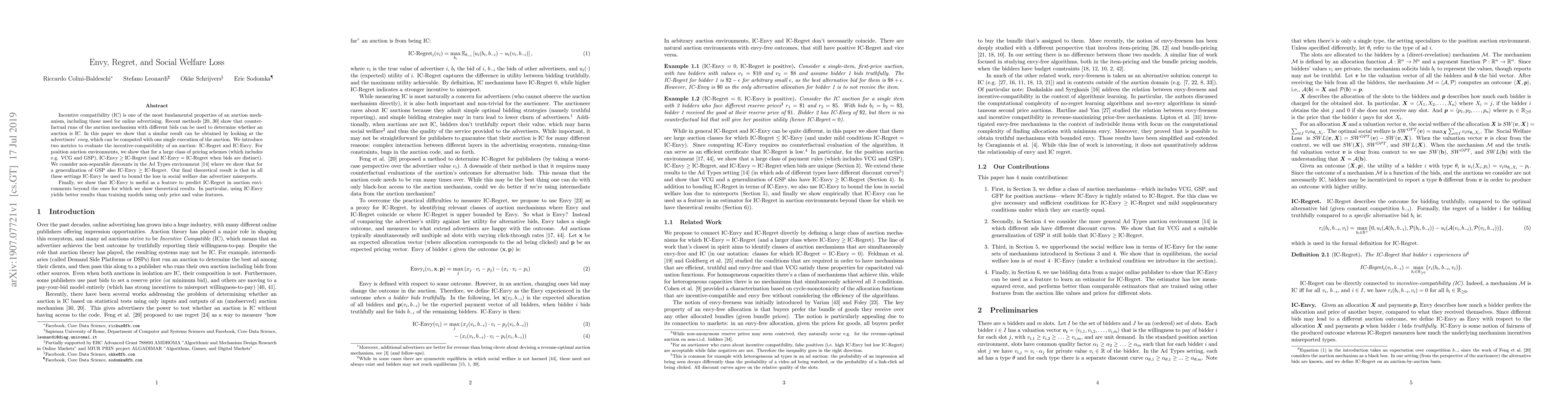Incentive compatibility (IC) is one of the most fundamental properties of an auction mechanism, including those used for online advertising. Recent methods by Feng et al. and Lahaie et al. show that counterfactual runs of the auction mechanism with different bids can be used to determine whether an auction is IC. In this paper we show that a similar result can be obtained by looking at the advertisers' envy, which can be computed with one single execution of the auction. We introduce two metrics to evaluate the incentive-compatibility of an auction: IC-Regret and IC-Envy. For position auction environments, we show that for a large class of pricing schemes (which includes e.g. VCG and GSP), IC-Envy $\ge$ IC-Regret (and IC-Envy = IC-Regret when bids are distinct). We consider non-separable discounts in the Ad Types environment of Colini-Baldeschi et al. where we show that for a generalization of GSP also IC-Envy $\ge$ IC-Regret. Our final theoretical result is that in all these settings IC-Envy be used to bound the loss in social welfare due advertiser misreports. Finally, we show that IC-Envy is useful as a feature to predict IC-Regret in auction environments beyond the ones for which we show theoretical results. In particular, using IC-Envy yields better results than training models using only price and value features.