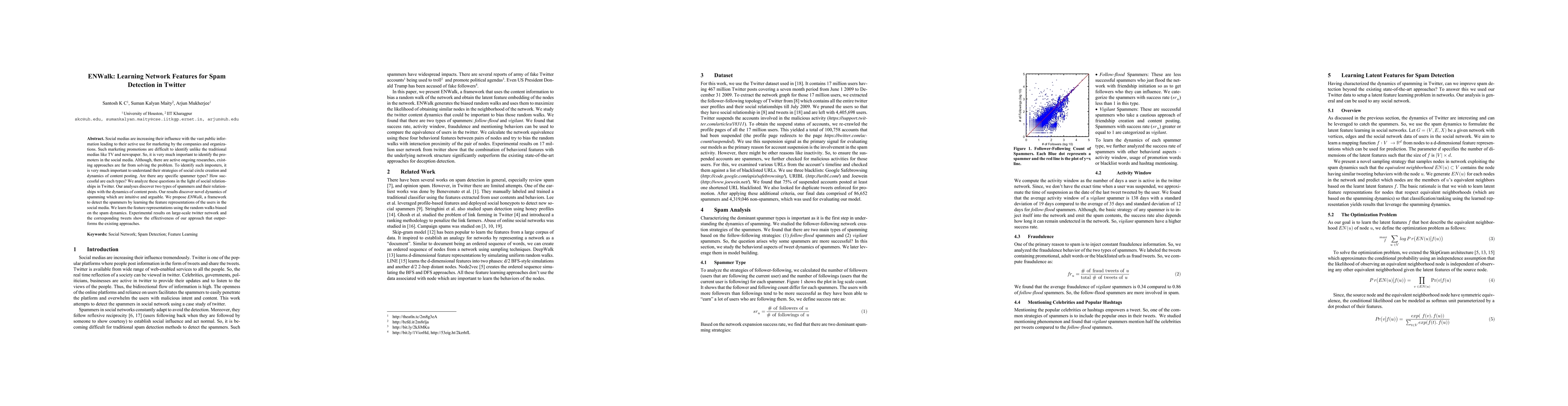 The paper introduces ENWalk, a framework for detecting spammers on Twitter by learning user feature representations through random walks biased on spam dynamics. Experimental results demonstrate ENWalk's effectiveness in outperforming existing methods.