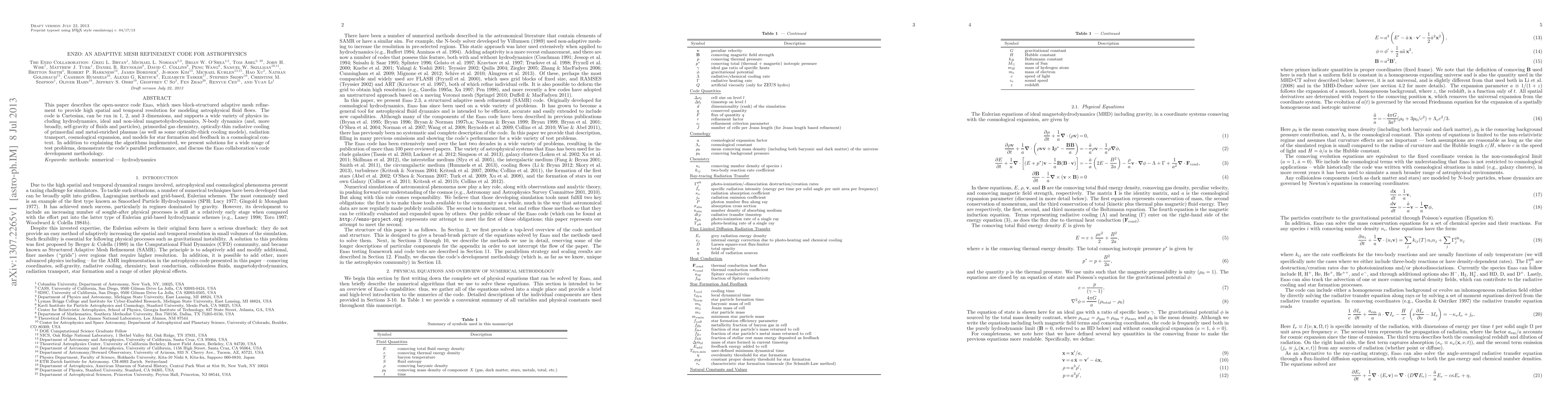 Enzo is an open-source adaptive mesh refinement code designed for high-resolution modeling of astrophysical fluid flows, supporting diverse physics including magnetohydrodynamics and star formation. The code demonstrates robust parallel performance and a comprehensive suite of test problem solutions.