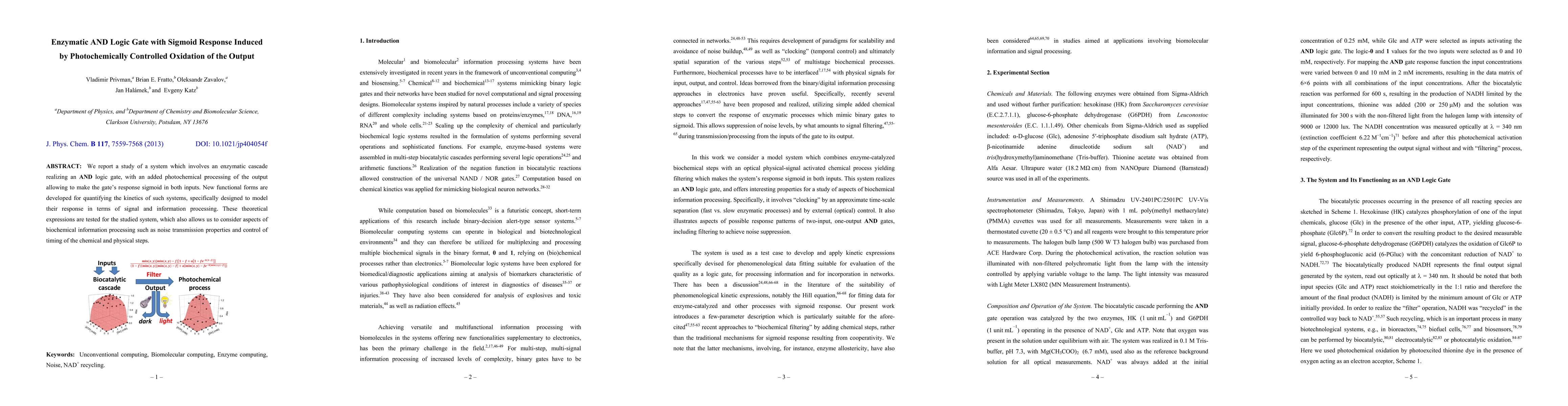 This paper presents an enzymatic cascade that functions as an AND logic gate with a sigmoid response, achieved through photochemical control of the output. New kinetic models are developed to quantify the system's behavior, which are tested to analyze signal processing, noise transmission, and timing control in biochemical information processing.