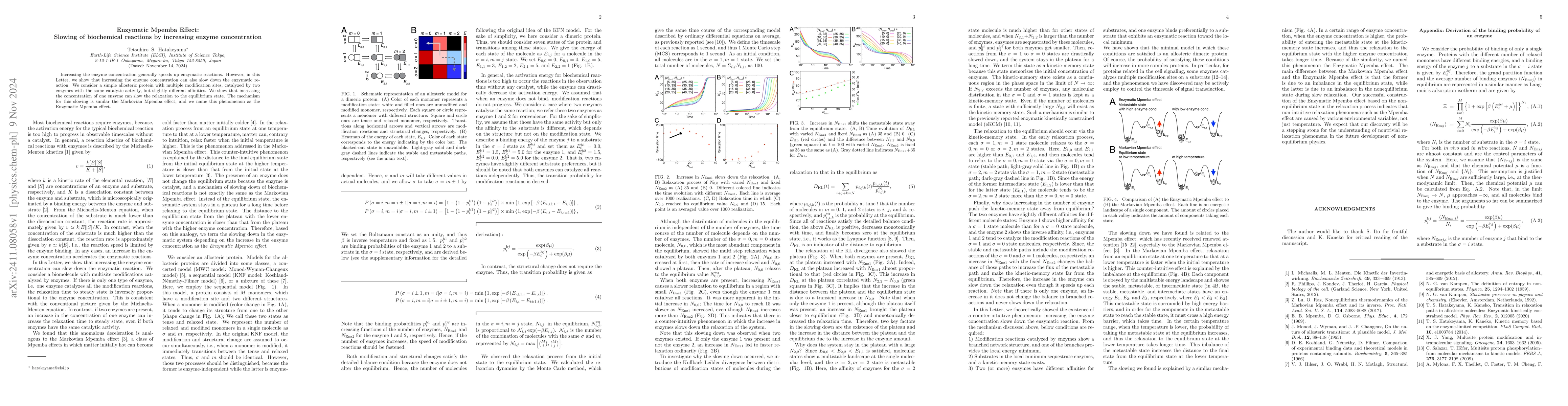 This paper demonstrates that increasing enzyme concentration can paradoxically slow enzymatic reactions in certain complex systems, akin to the Markovian Mpemba effect, termed the Enzymatic Mpemba effect, due to the interaction between two enzymes with slightly different affinities in an allosteric protein.