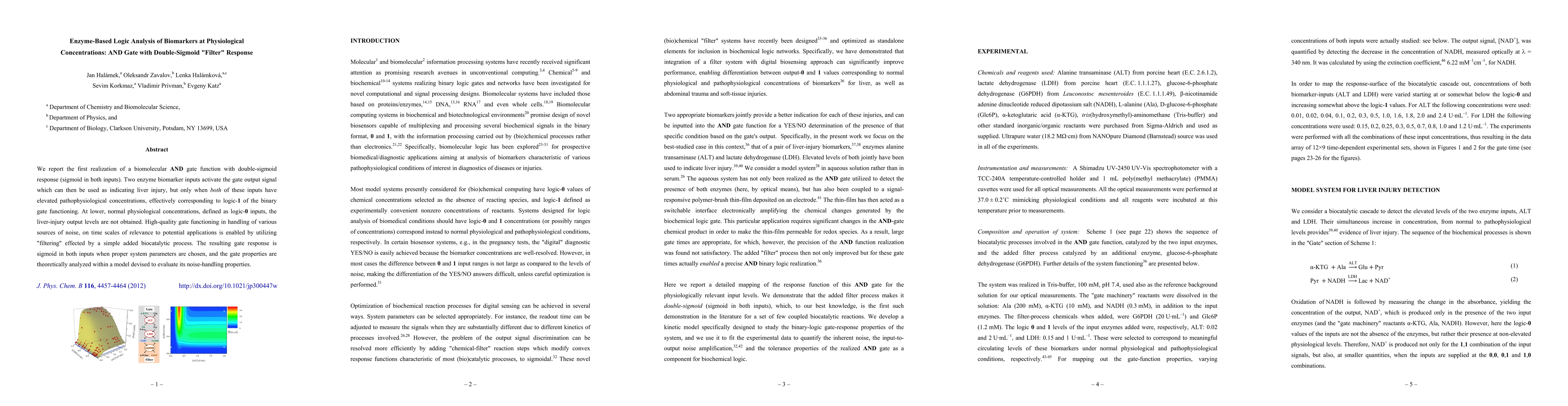 This paper presents the first biomolecular AND gate with a double-sigmoid response, designed to detect liver injury only when two enzyme biomarkers are both elevated. The gate effectively filters out noise and operates reliably at physiological concentrations.
