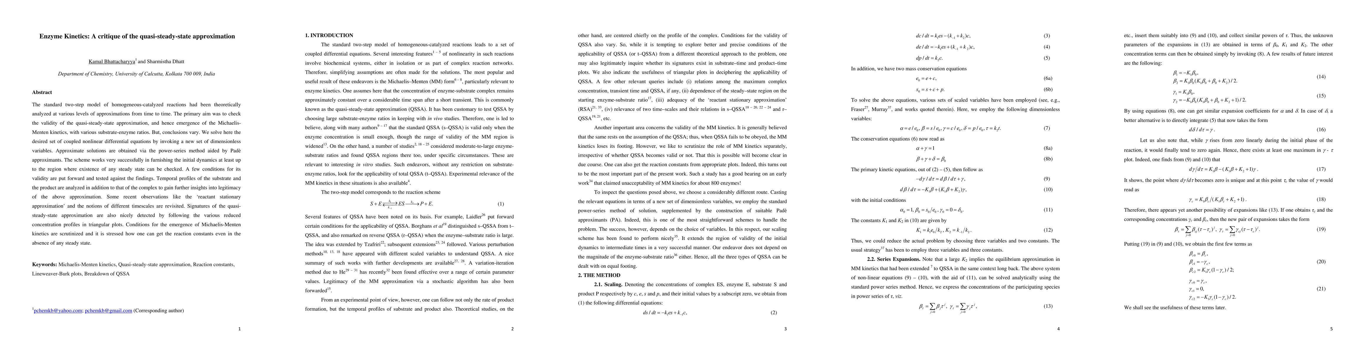 This paper critiques the quasi-steady-state approximation in enzyme kinetics, solving coupled nonlinear differential equations to analyze the initial dynamics and conditions for Michaelis-Menten kinetics. It finds that the approximation can still be valid even without a steady state, and explores different timescales and concentration profiles to validate the approach.