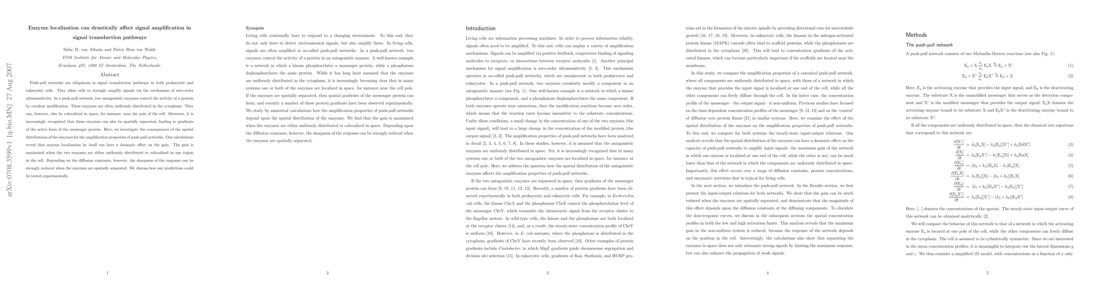 This paper investigates how the spatial distribution of antagonistic enzymes in push-pull networks affects signal amplification in signal transduction pathways. The study finds that enzyme localization can drastically influence amplification gain, with the highest gain achieved when enzymes are either uniformly distributed or colocalized.