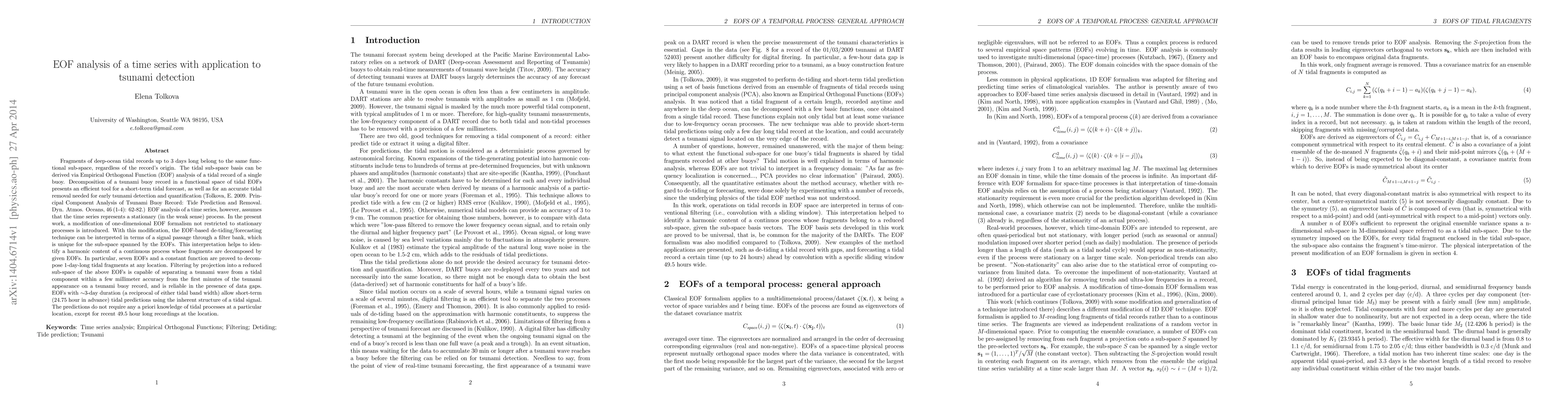 This paper introduces a modified Empirical Orthogonal Function (EOF) analysis for non-stationary time series, specifically applied to tsunami detection. The method efficiently separates tsunami waves from tidal components using EOFs derived from tidal records, achieving high accuracy even with data gaps.