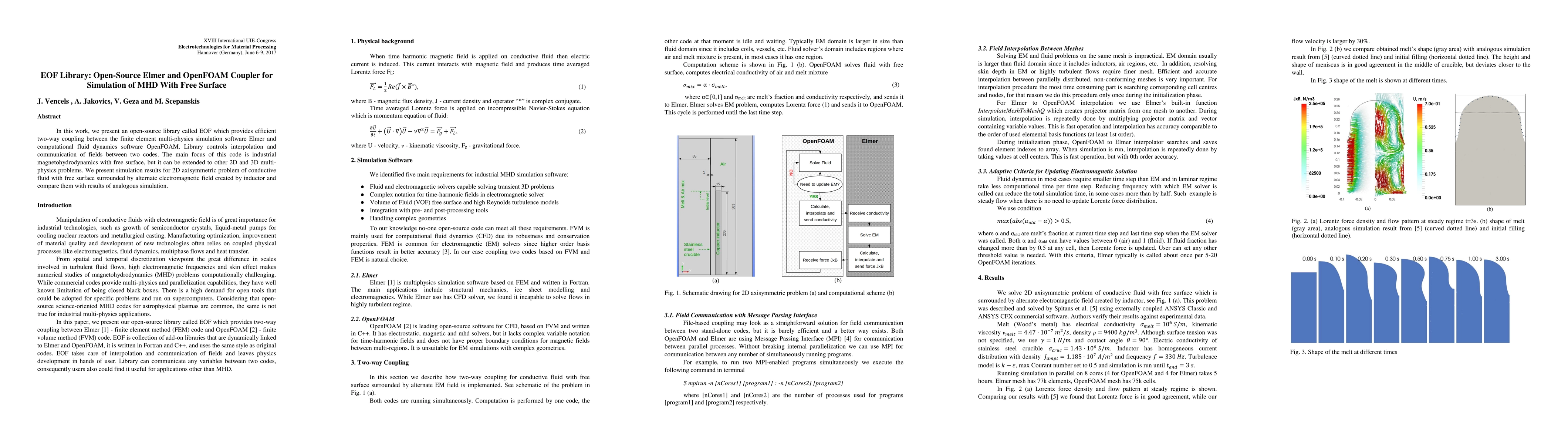 The EOF Library enables efficient two-way coupling between Elmer and OpenFOAM for simulating magnetohydrodynamics with free surfaces. It facilitates interpolation and communication between the two codes, demonstrating its utility through a 2D axisymmetric conductive fluid simulation.