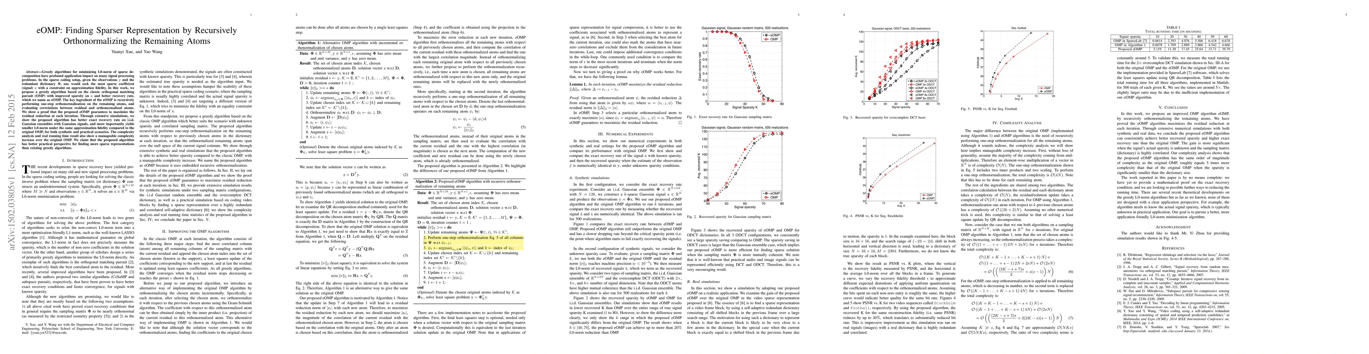 Greedy algorithms for minimizing L0-norm of sparse decomposition have profound application impact on many signal processing problems. In the sparse coding setup, given the observations $\mathrm{y}$ and the redundant dictionary $\mathbf{\Phi}$, one would seek the most sparse coefficient (signal) $\mathrm{x}$ with a constraint on approximation fidelity. In this work, we propose a greedy algorithm based on the classic orthogonal matching pursuit (OMP) with improved sparsity on $\mathrm{x}$ and better recovery rate, which we name as eOMP. The key ingredient of the eOMP is recursively performing one-step orthonormalization on the remaining atoms, and evaluating correlations between residual and orthonormalized atoms. We show a proof that the proposed eOMP guarantees to maximize the residual reduction at each iteration. Through extensive simulations, we show the proposed algorithm has better exact recovery rate on i.i.d. Gaussian ensembles with Gaussian signals, and more importantly yields smaller L0-norm under the same approximation fidelity compared to the original OMP, for both synthetic and practical scenarios. The complexity analysis and real running time result also show a manageable complexity increase over the original OMP. We claim that the proposed algorithm has better practical perspective for finding more sparse representations than existing greedy algorithms.