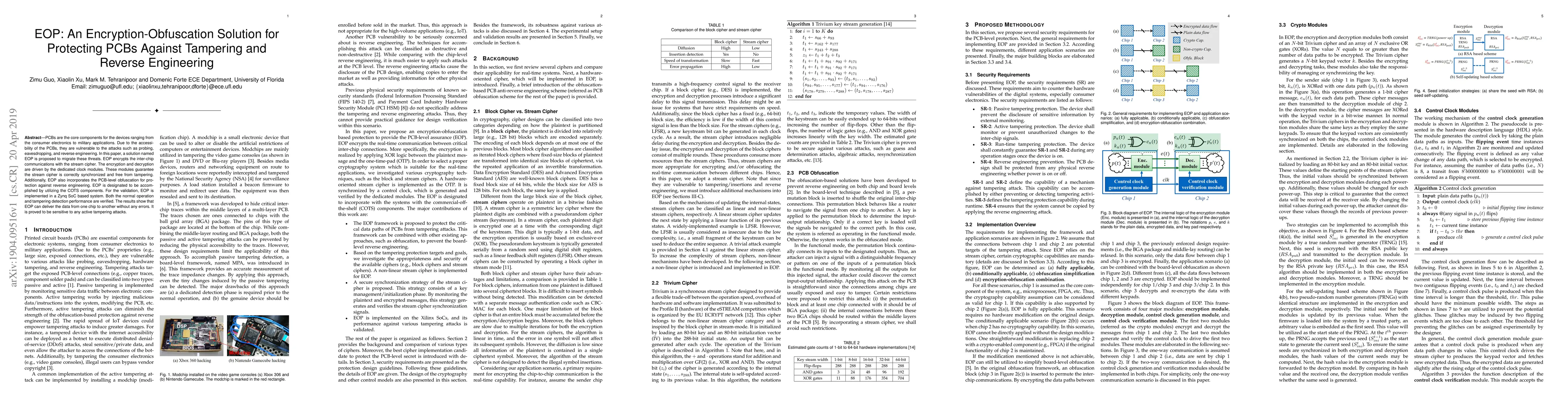 This paper proposes EOP, an encryption-obfuscation solution to protect PCBs from tampering and reverse engineering. EOP uses a stream cipher for inter-chip communication encryption and employs dedicated clock modules to ensure synchronization and tamper resistance, along with PCB-level obfuscation.