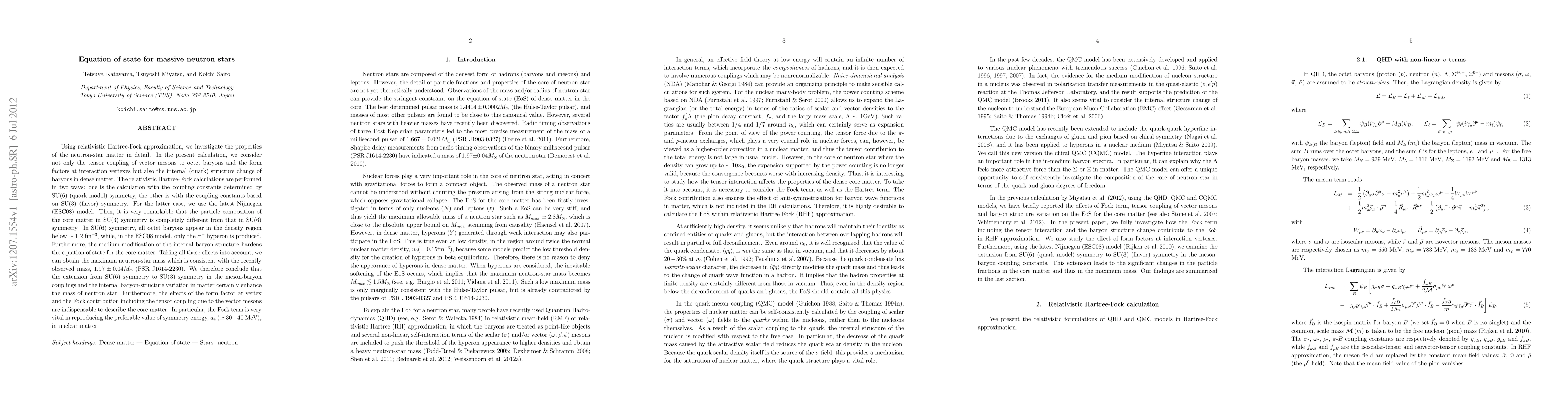 Using relativistic Hartree-Fock approximation, we investigate the properties of the neutron-star matter in detail. In the present calculation, we consider not only the tensor coupling of vector mesons to octet baryons and the form factors at interaction vertexes but also the internal (quark) structure change of baryons in dense matter. The relativistic Hartree-Fock calculations are performed in two ways: one is the calculation with the coupling constants determined by SU(6) (quark model) symmetry, the other is with the coupling constants based on SU(3) (flavor) symmetry. For the latter case, we use the latest Nijmegen (ESC08) model. Then, it is very remarkable that the particle composition of the core matter in SU(3) symmetry is completely different from that in SU(6) symmetry. In SU(6) symmetry, all octet baryons appear in the density region below $\sim 1.2$ fm$^{-3}$, while, in the ESC08 model, only the \Xi^- hyperon is produced. Furthermore, the medium modification of the internal baryon structure hardens the equation of state for the core matter. Taking all these effects into account, we can obtain the maximum neutron-star mass which is consistent with the recently observed mass, 1.97 \pm 0.04 M_\sun (PSR J1614-2230). We therefore conclude that the extension from SU(6) symmetry to SU(3) symmetry in the meson-baryon couplings and the internal baryon-structure variation in matter certainly enhance the mass of neutron star. Furthermore, the effects of the form factor at vertex and the Fock contribution including the tensor coupling due to the vector mesons are indispensable to describe the core matter. In particular, the Fock term is very vital in reproducing the preferable value of symmetry energy, a_4 (\simeq 30 - 40 MeV), in nuclear matter.