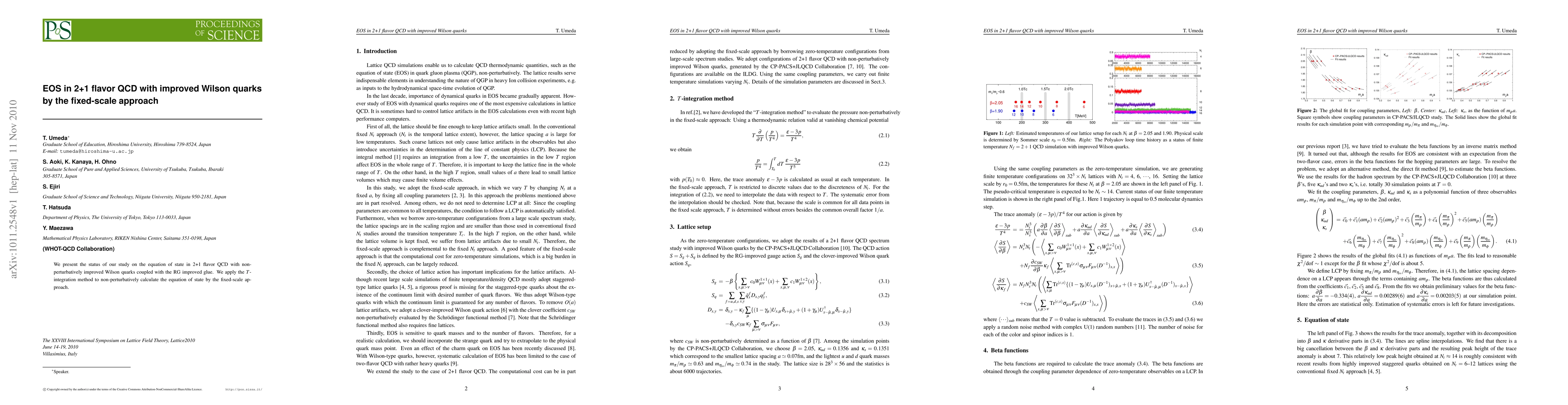 This study investigates the equation of state in 2+1 flavor QCD using non-perturbatively improved Wilson quarks and RG improved gluons. The T-integration method is employed with the fixed-scale approach to non-perturbatively compute the equation of state.