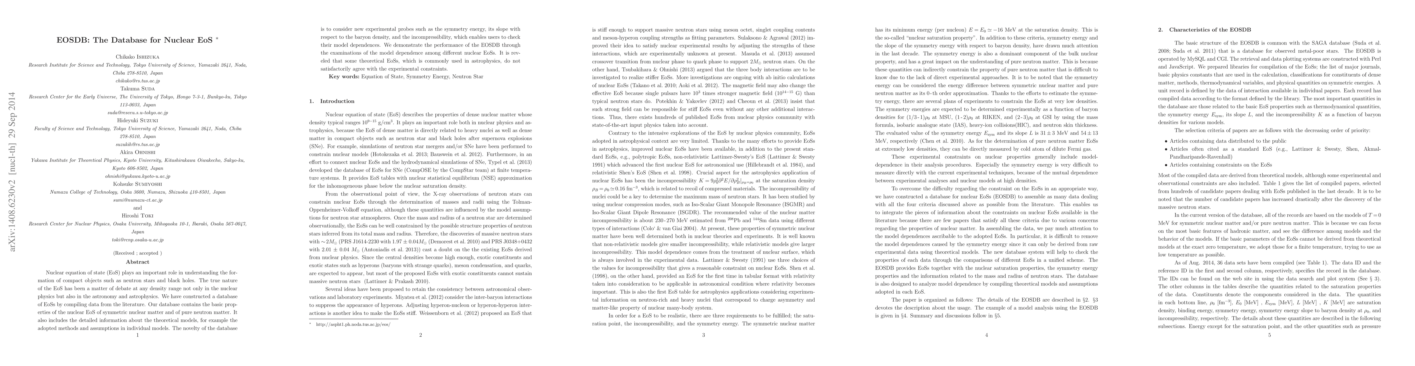 EOSDB compiles nuclear equation of state (EoS) data from literature, providing detailed properties and theoretical models for symmetric and neutron matter. It highlights discrepancies between commonly used astrophysical EoSs and experimental constraints, emphasizing model dependence.