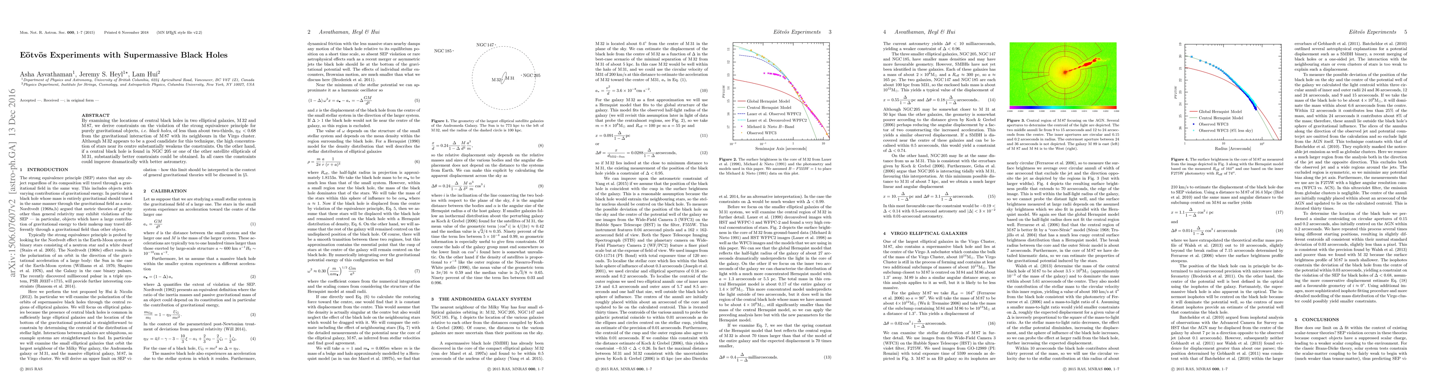 By examining the locations of central black holes in two elliptical galaxies, M\,32 and M\,87, we derive constraints on the violation of the strong equivalence principle for purely gravitational objects, i.e. black holes, of less than about two-thirds, $\eta_N<0.68$ from the gravitational interaction of M\,87 with its neighbours in the Virgo cluster. Although M\,32 appears to be a good candidate for this technique, the high concentration of stars near its centre substantially weakens the constraints. On the other hand, if a central black hole is found in NGC 205 or one of the other satellite ellipticals of M\,31, substantially better constraints could be obtained. In all cases the constraints could improve dramatically with better astrometry.