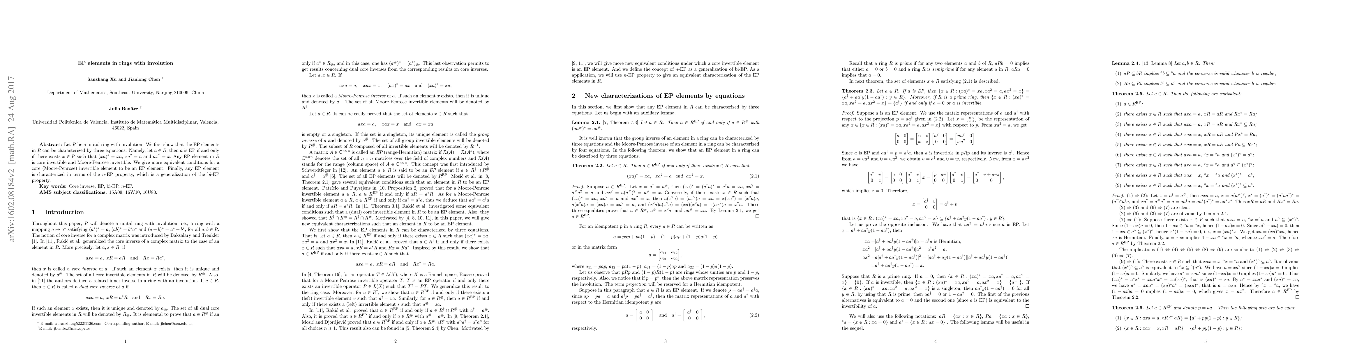 Let $R$ be a unital ring with involution. We first show that the EP elements in $R$ can be characterized by three equations. Namely, let $a\in R$, then $a$ is EP if and only if there exists $x\in R$ such that $(xa)^{\ast}=xa$, $xa^{2}=a$ and $ax^{2}=x.$ It is well known that all EP elements in $R$ are core invertible and Moore-Penrose invertible. We give more equivalent conditions for a core (Moore-Penrose) invertible element to be an EP element. Finally, the EP elements are characterized in terms of $n$-EP property, which is a generalization of bi-EP property.