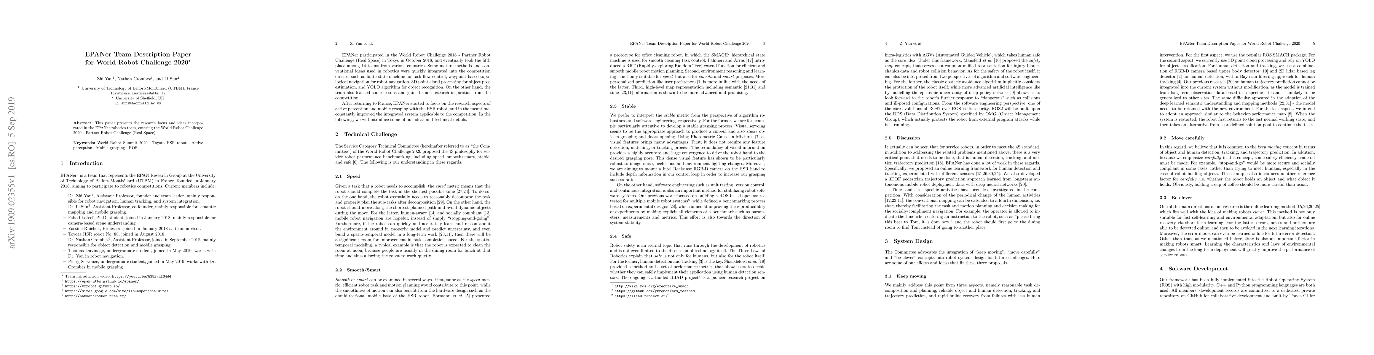 This paper presents the research focus and ideas incorporated in the EPANer robotics team, entering the World Robot Challenge 2020 - Partner Robot Challenge (Real Space).