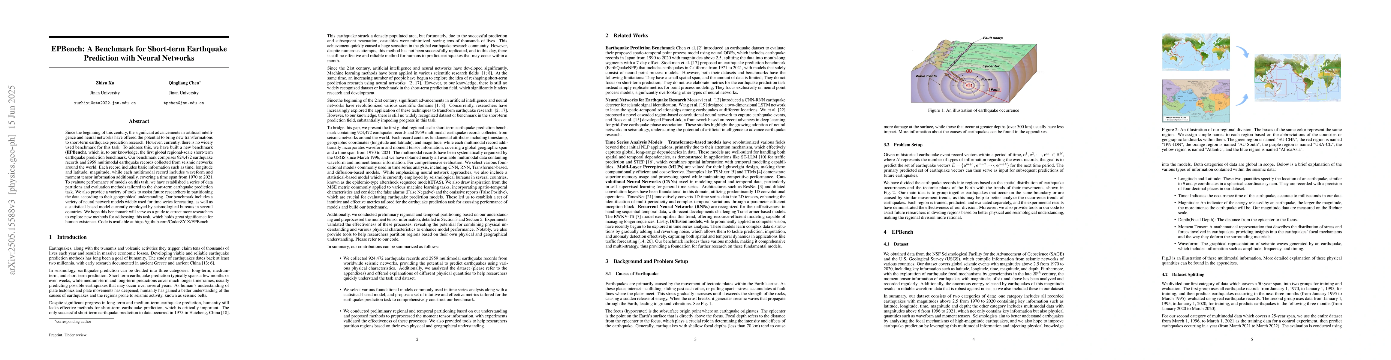 A new benchmark (EPBench) has been created for short-term earthquake prediction with neural networks, featuring 924,472 records from seismic networks worldwide, to facilitate research in this area.