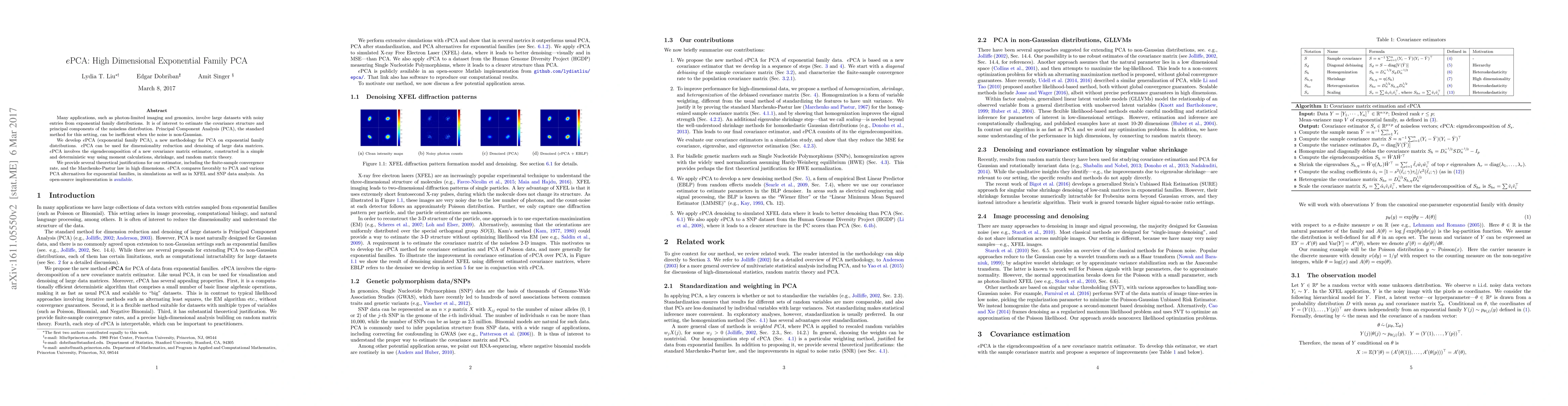 Many applications, such as photon-limited imaging and genomics, involve large datasets with noisy entries from exponential family distributions. It is of interest to estimate the covariance structure and principal components of the noiseless distribution. Principal Component Analysis (PCA), the standard method for this setting, can be inefficient when the noise is non-Gaussian. We develop $e$PCA (exponential family PCA), a new methodology for PCA on exponential family distributions. $e$PCA can be used for dimensionality reduction and denoising of large data matrices. $e$PCA involves the eigendecomposition of a new covariance matrix estimator, constructed in a simple and deterministic way using moment calculations, shrinkage, and random matrix theory. We provide several theoretical justifications for our estimator, including the finite-sample convergence rate, and the Marchenko-Pastur law in high dimensions. $e$PCA compares favorably to PCA and various PCA alternatives for exponential families, in simulations as well as in XFEL and SNP data analysis. An open-source implementation is available.