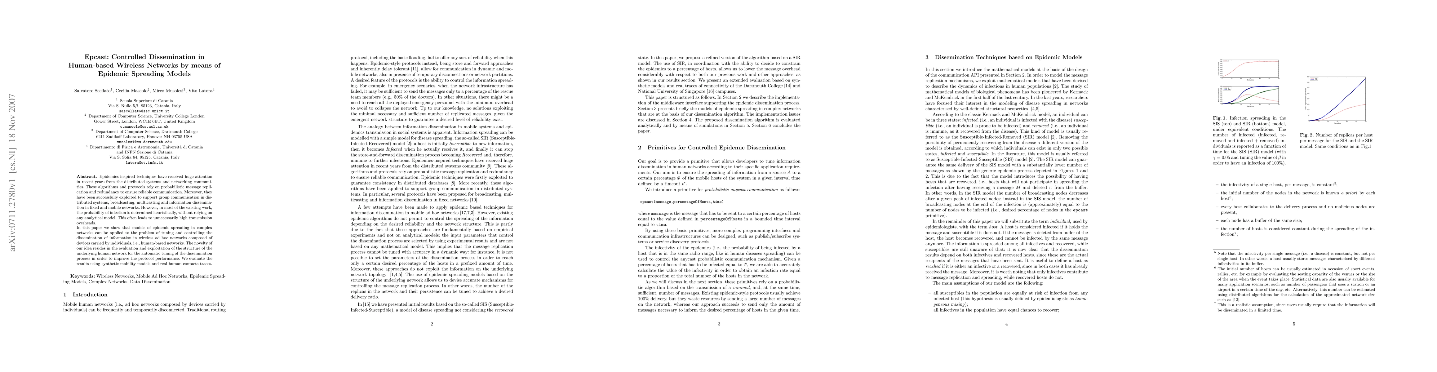This paper proposes using epidemic spreading models to control information dissemination in human-based wireless networks, leveraging the structure of human interactions to optimize protocol performance. The study evaluates the approach using both synthetic and real-world mobility data to demonstrate reduced transmission overheads.