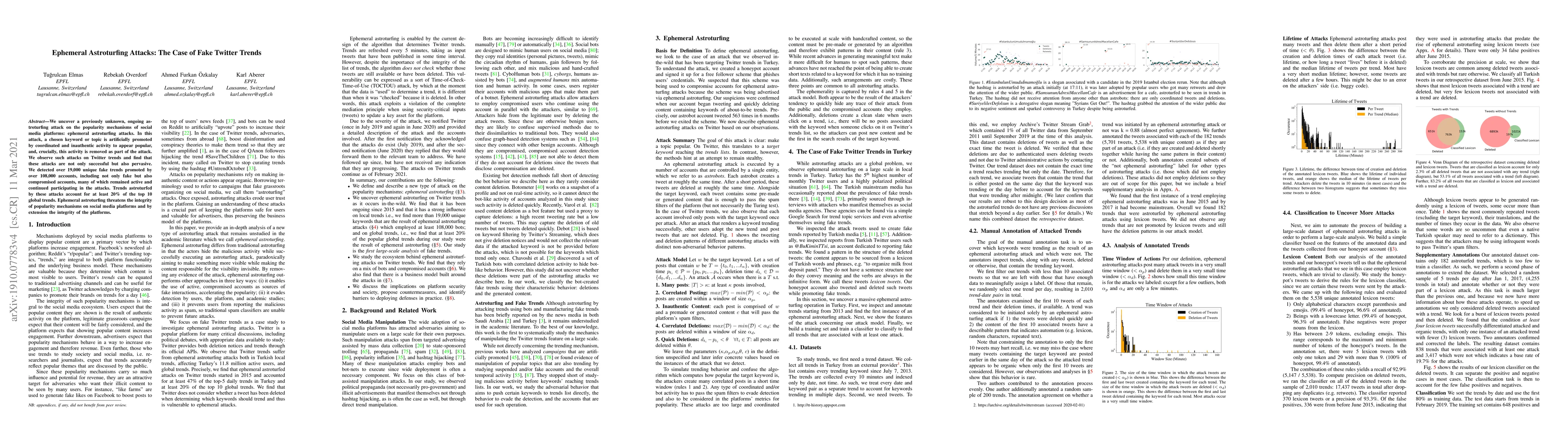 We uncover a previously unknown, ongoing astroturfing attack on the popularity mechanisms of social media platforms: ephemeral astroturfing attacks. In this attack, a chosen keyword or topic is artificially promoted by coordinated and inauthentic activity to appear popular, and, crucially, this activity is removed as part of the attack. We observe such attacks on Twitter trends and find that these attacks are not only successful but also pervasive. We detected over 19,000 unique fake trends promoted by over 108,000 accounts, including not only fake but also compromised accounts, many of which remained active and continued participating in the attacks. Trends astroturfed by these attacks account for at least 20% of the top 10 global trends. Ephemeral astroturfing threatens the integrity of popularity mechanisms on social media platforms and by extension the integrity of the platforms.