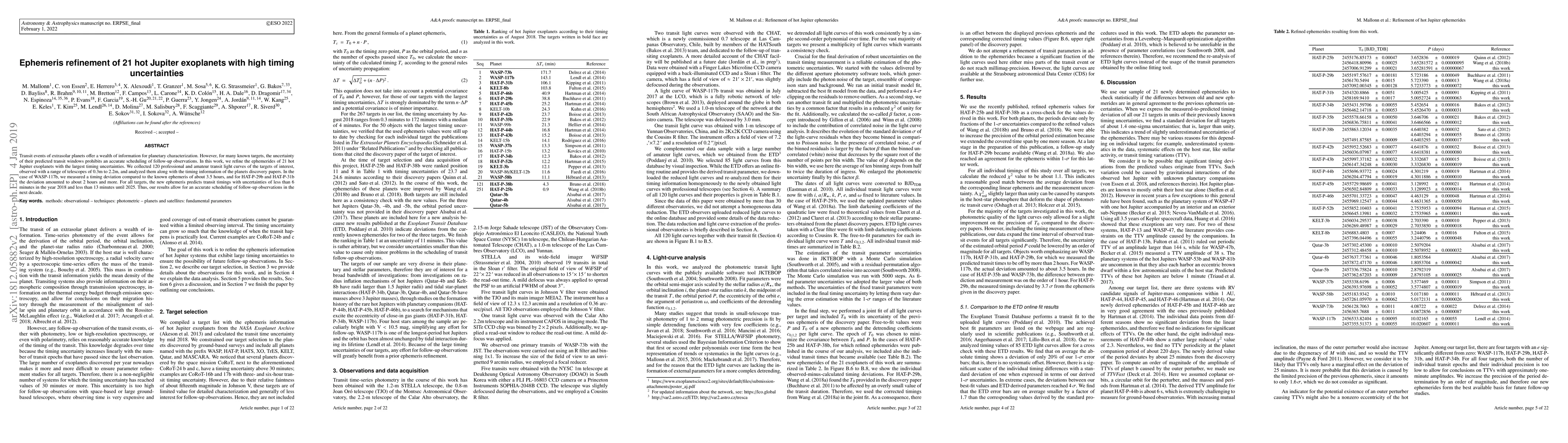 This study refines the ephemerides of 21 Hot Jupiter exoplanets with high timing uncertainties by analyzing 120 transit light curves. The new ephemerides reduce transit timing uncertainties to less than 6 minutes in 2018 and less than 13 minutes until 2025, facilitating precise follow-up observations.