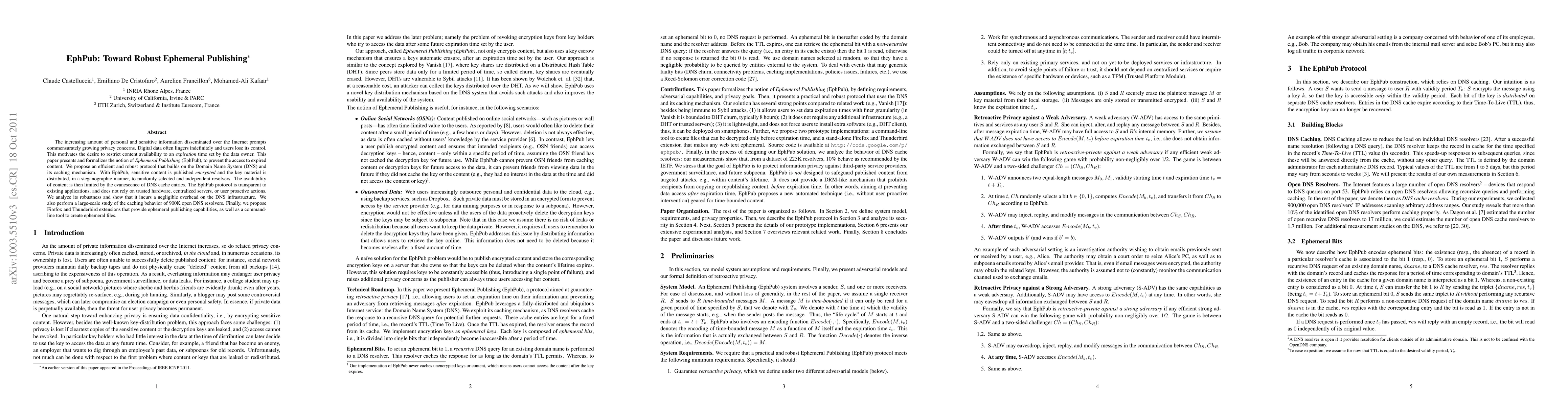 The increasing amount of personal and sensitive information disseminated over the Internet prompts commensurately growing privacy concerns. Digital data often lingers indefinitely and users lose its control. This motivates the desire to restrict content availability to an expiration time set by the data owner. This paper presents and formalizes the notion of Ephemeral Publishing (EphPub), to prevent the access to expired content. We propose an efficient and robust protocol that builds on the Domain Name System (DNS) and its caching mechanism. With EphPub, sensitive content is published encrypted and the key material is distributed, in a steganographic manner, to randomly selected and independent resolvers. The availability of content is then limited by the evanescence of DNS cache entries. The EphPub protocol is transparent to existing applications, and does not rely on trusted hardware, centralized servers, or user proactive actions. We analyze its robustness and show that it incurs a negligible overhead on the DNS infrastructure. We also perform a large-scale study of the caching behavior of 900K open DNS resolvers. Finally, we propose Firefox and Thunderbird extensions that provide ephemeral publishing capabilities, as well as a command-line tool to create ephemeral files.