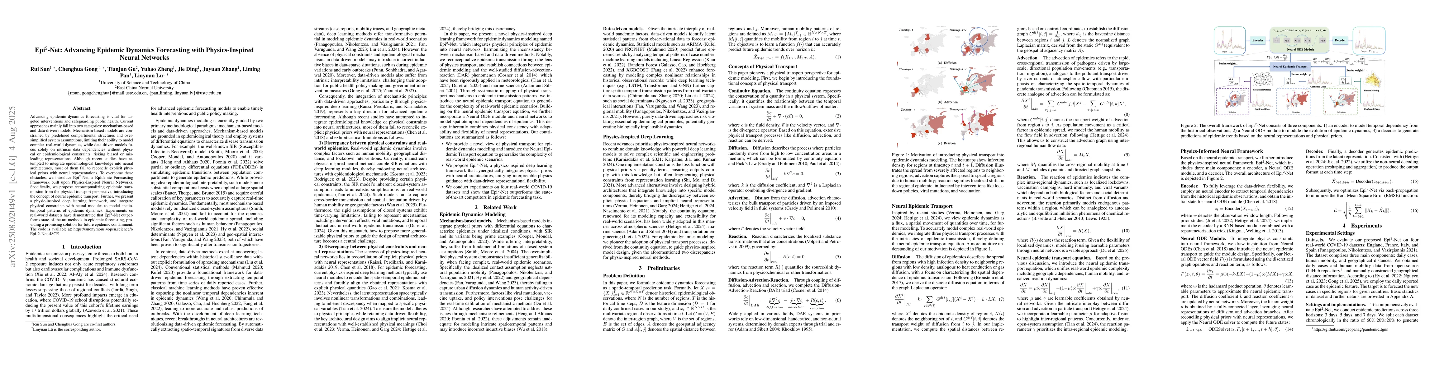 Advancing epidemic dynamics forecasting is vital for targeted interventions and safeguarding public health. Current approaches mainly fall into two categories: mechanism-based and data-driven models. Mechanism-based models are constrained by predefined compartmental structures and oversimplified system assumptions, limiting their ability to model complex real-world dynamics, while data-driven models focus solely on intrinsic data dependencies without physical or epidemiological constraints, risking biased or misleading representations. Although recent studies have attempted to integrate epidemiological knowledge into neural architectures, most of them fail to reconcile explicit physical priors with neural representations. To overcome these obstacles, we introduce Epi$^2$-Net, a Epidemic Forecasting Framework built upon Physics-Inspired Neural Networks. Specifically, we propose reconceptualizing epidemic transmission from the physical transport perspective, introducing the concept of neural epidemic transport. Further, we present a physic-inspired deep learning framework, and integrate physical constraints with neural modules to model spatio-temporal patterns of epidemic dynamics. Experiments on real-world datasets have demonstrated that Epi$^2$-Net outperforms state-of-the-art methods in epidemic forecasting, providing a promising solution for future epidemic containment. The code is available at: https://anonymous.4open.science/r/Epi-2-Net-48CE.