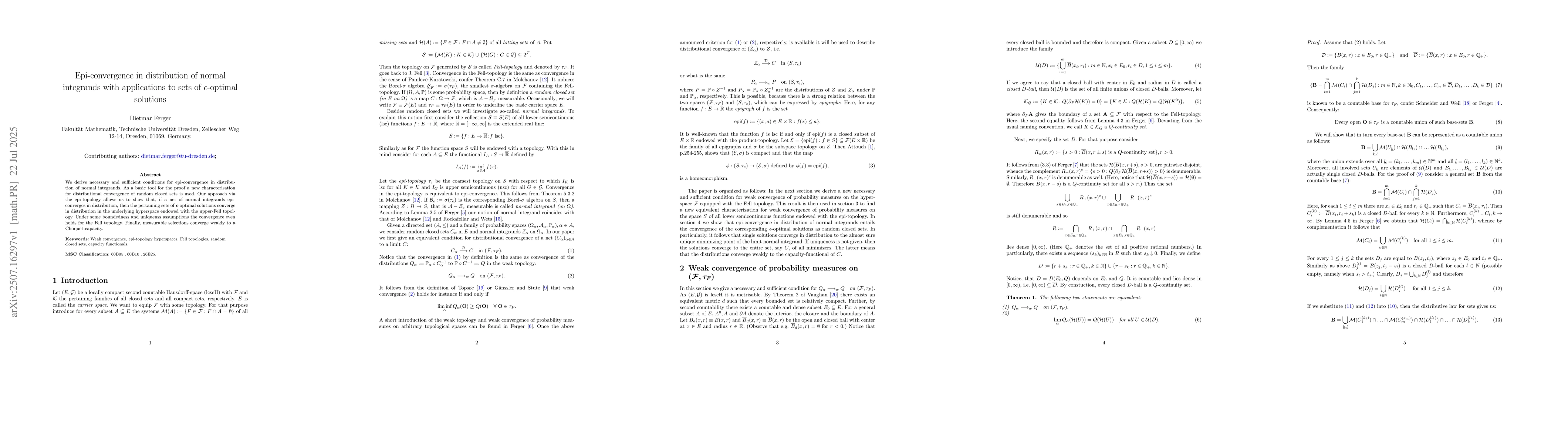We derive necessary and sufficient conditions for epi-convergence in distribution of normal integrands. As a basic tool for the proof a new characterisation for distributional convergence of random closed sets is used. Our approach via the epi-topology allows us to show that, if a net of normal integrands epiconverges in distribution, then the pertaining sets of epsilon-optimal solutions converge in distribution in the underlying hyperspace endowed with the upper-Fell topology. Under some boundedness and uniquenss assumptions the convergence even holds for the Fell topology. Finally, measurable selections converge weakly to a Choquet-capacity.